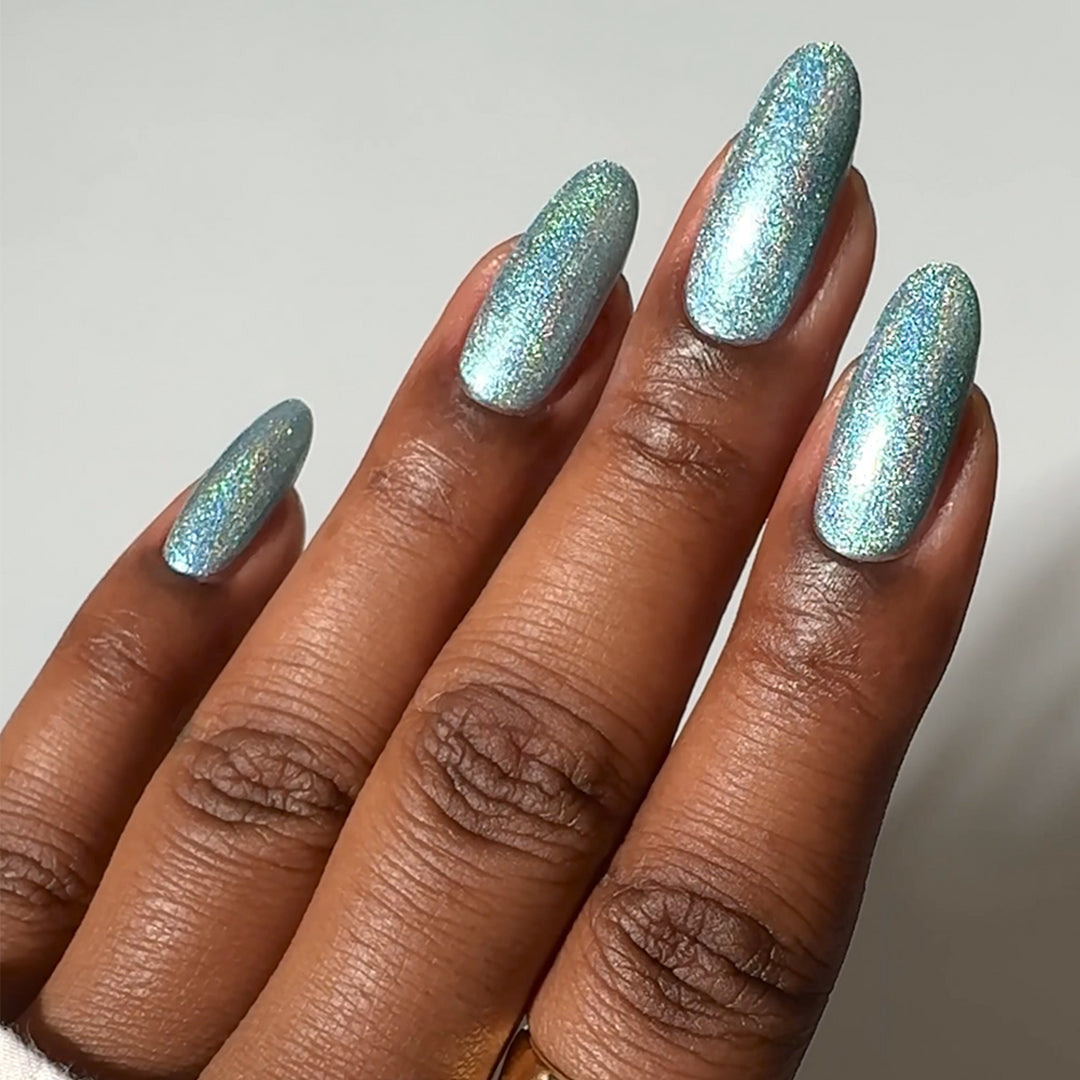 - Pale aquamarine linear holographic formula with cyan shimmer