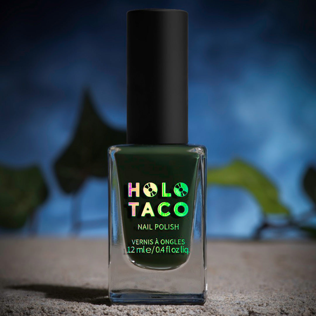 - Dark hunter green polish with a crème formula