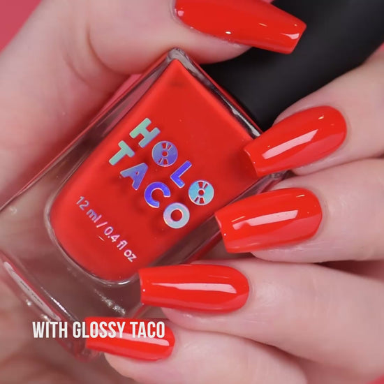 Note: Super-pigmented shades like this one may cause staining depending on the porousness of the nail and the use of a protective base coat. Swatch photos as pictured have one coat of Glossy Taco for optimal smoothness and shine.