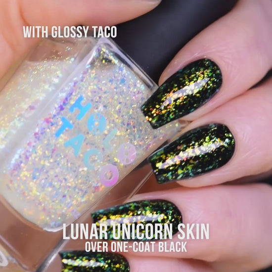 - Pro glossy tip: Finish off with a Glossy Taco to achieve that glossy finish and make your mani last longer without chipping. A top coat will help seal in the Unicorn Skin topper!