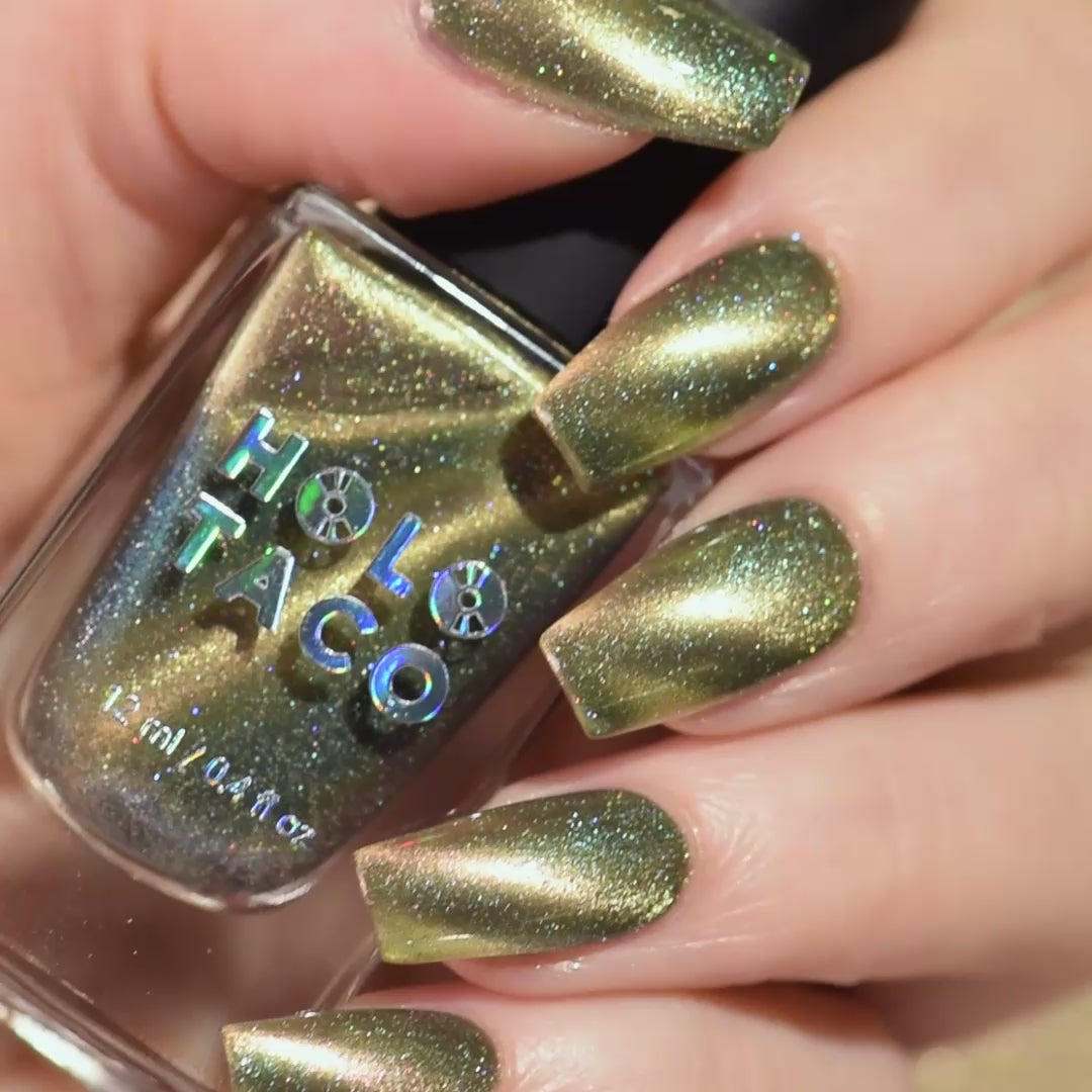 - Sage green polish with a pale white gold magnetic stripe, scattered holographic micro-glitters and green iridescent shimmer