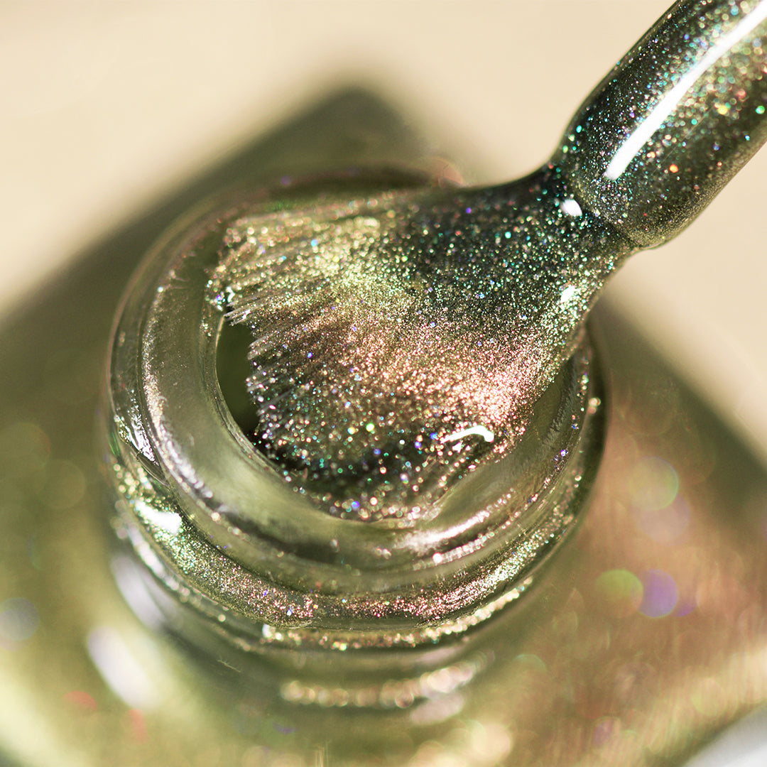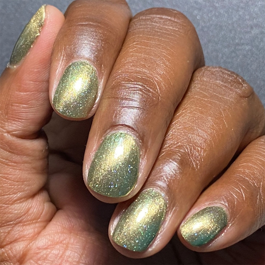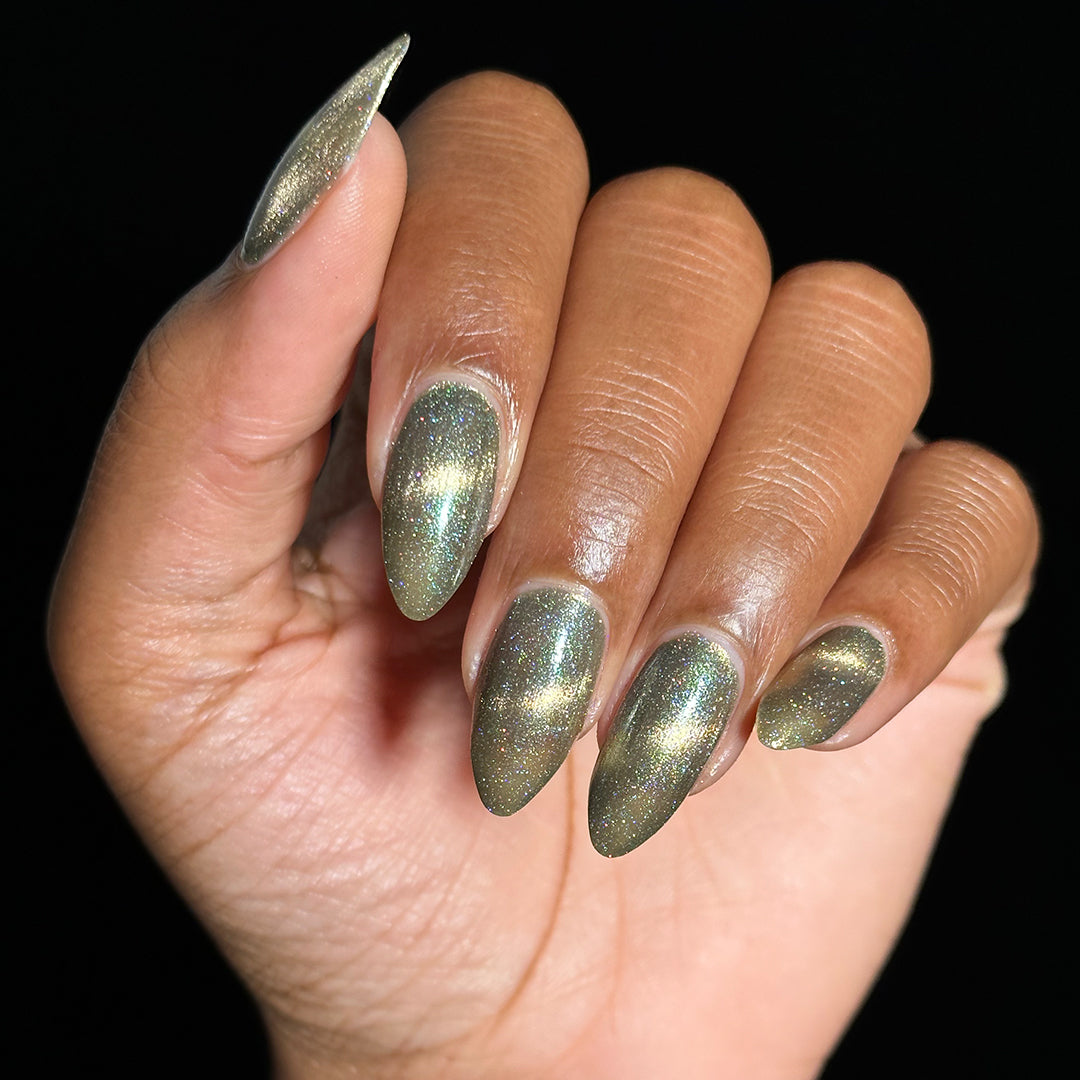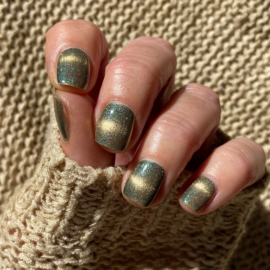 - Sage green polish with a pale white gold magnetic stripe, scattered holographic micro-glitters and green iridescent shimmer