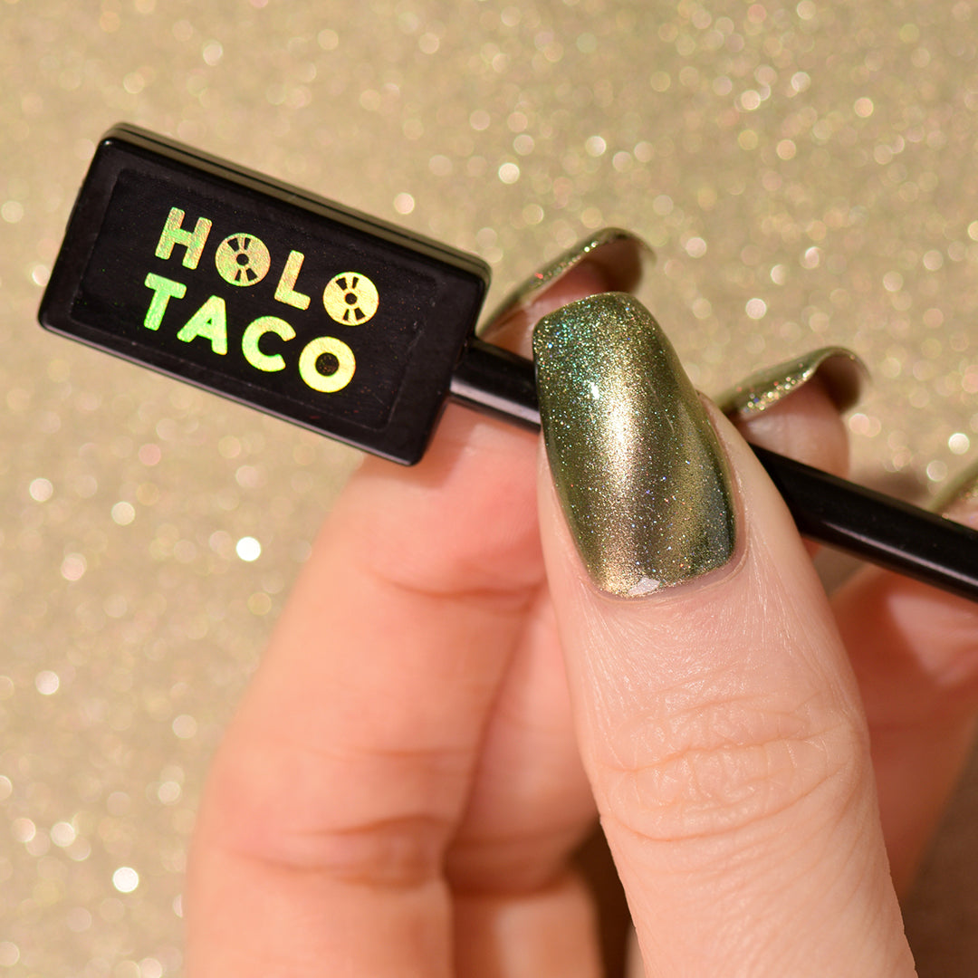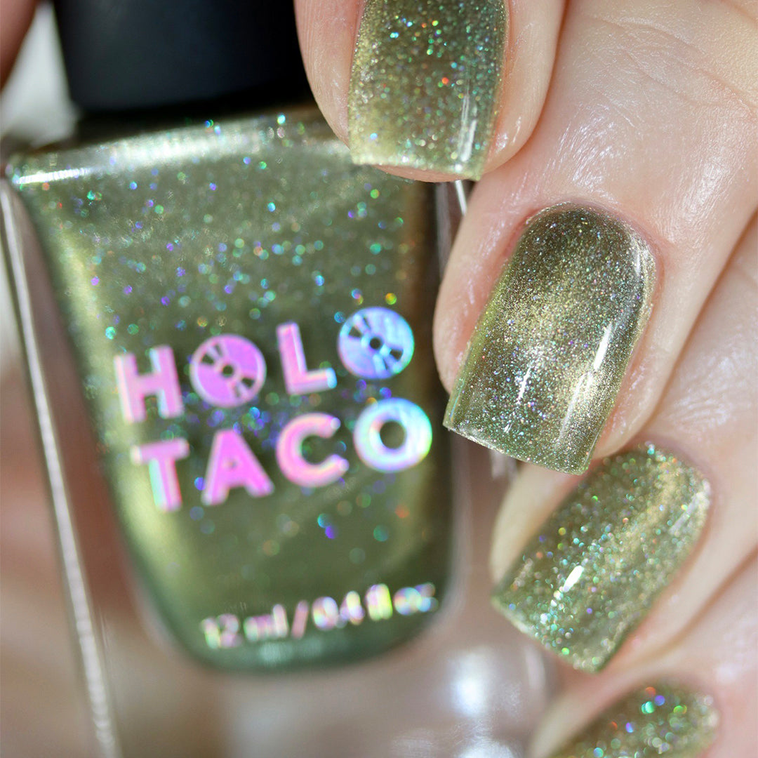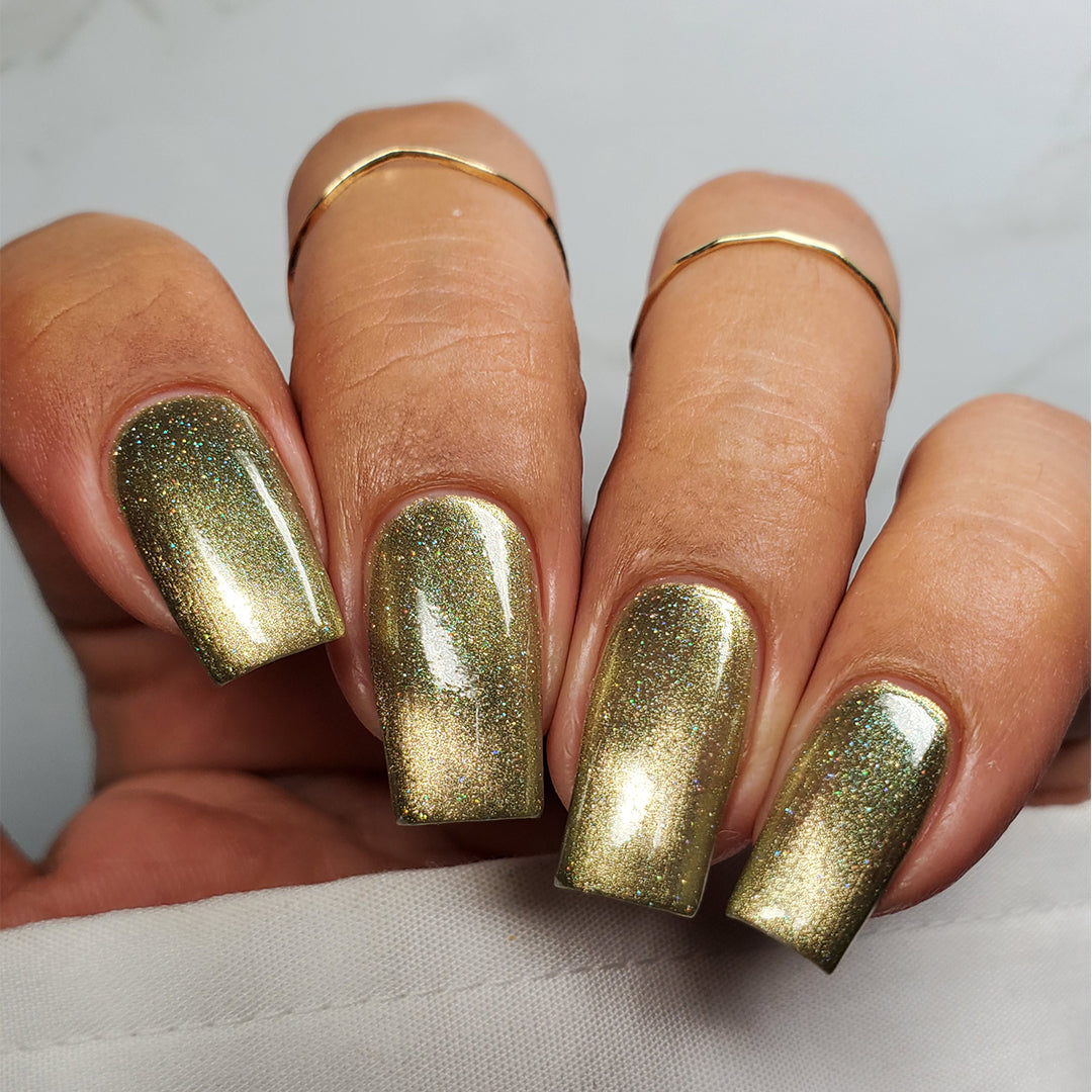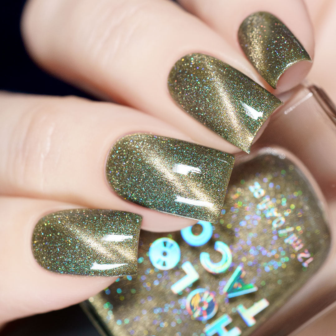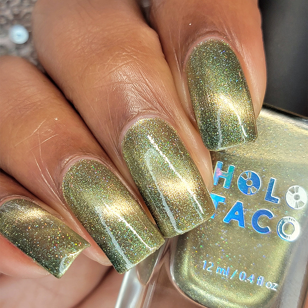 - Sage green polish with a pale white gold magnetic stripe, scattered holographic micro-glitters and green iridescent shimmer