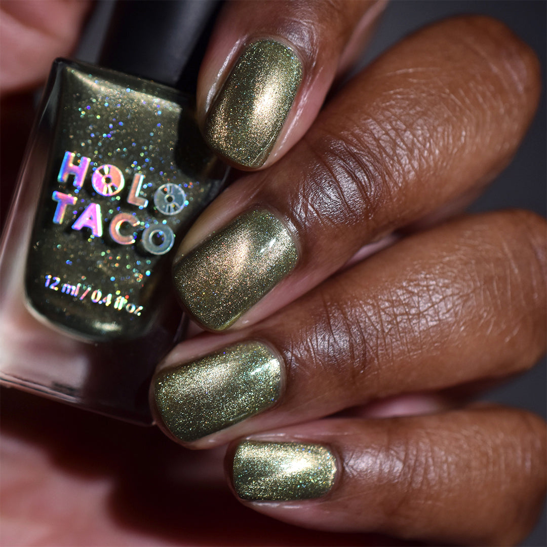 Normally I’m more of a blue-green mani girl, but Menchie is so pretty. I haven’t worn her yet, but she’s very sophisticated and will go well with your olive-green toned outfits. She also has a subtle scattered rainbow holo in the sunlight which I love