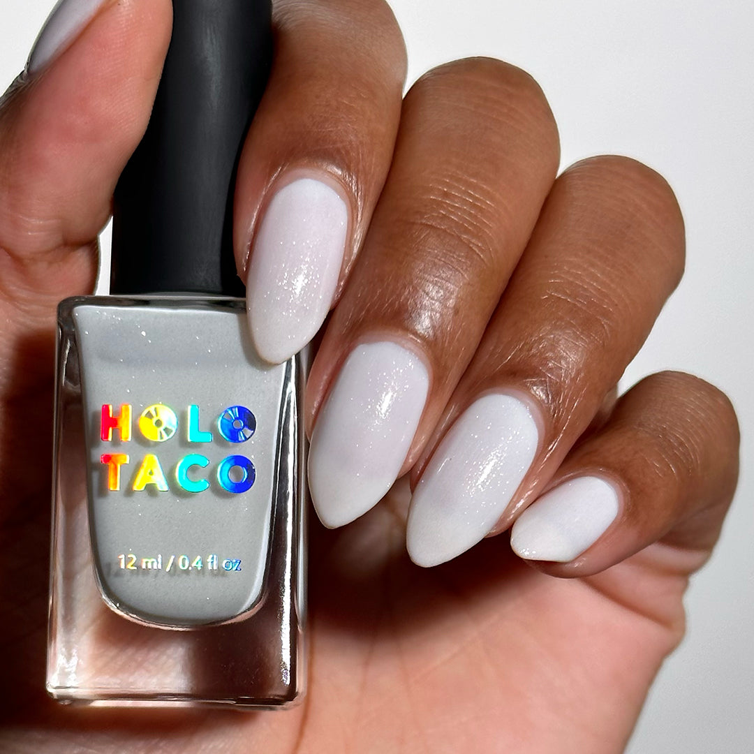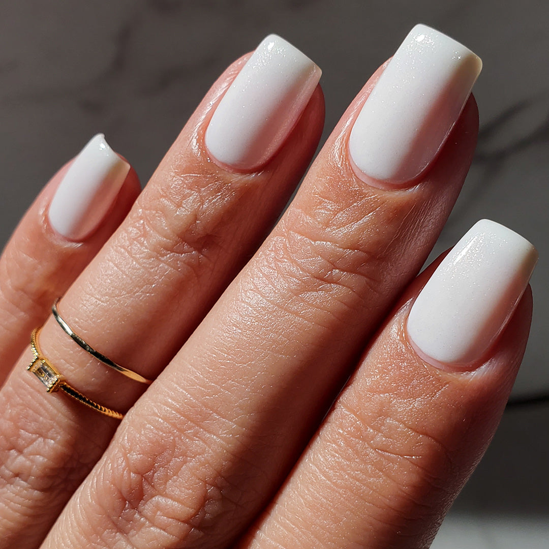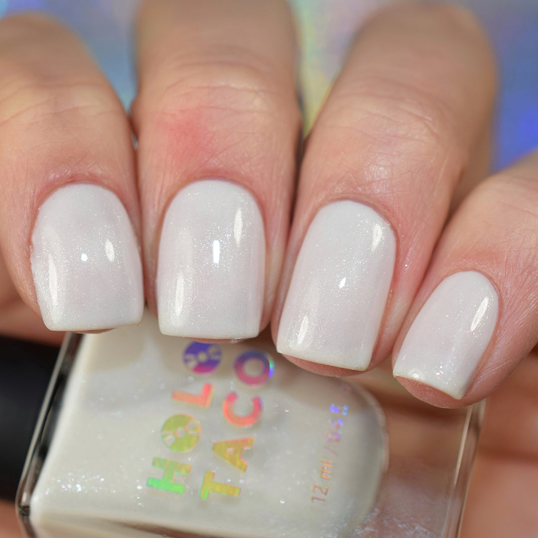 - Milky white jelly base with fine white shimmer for a clean glowing look