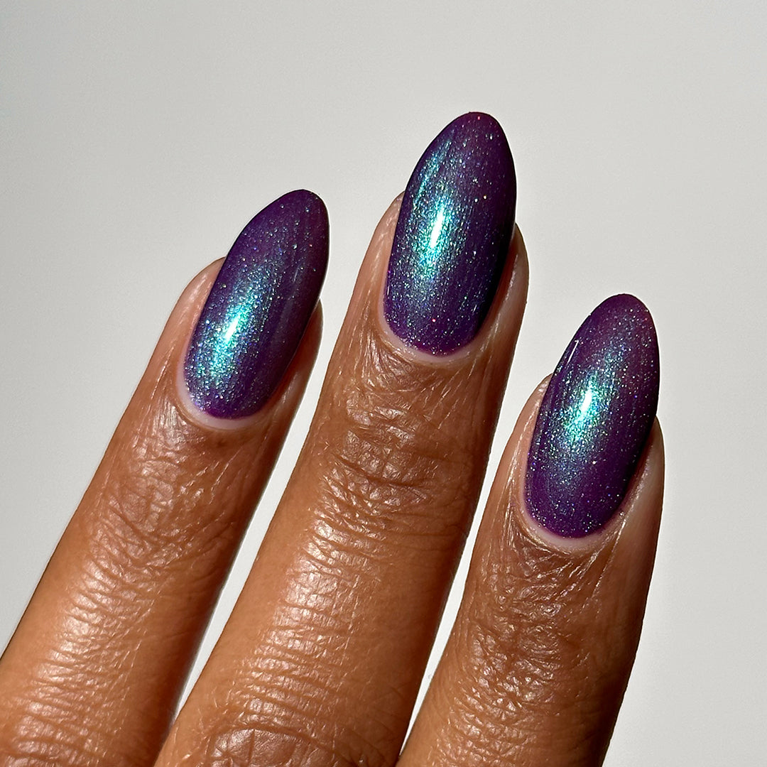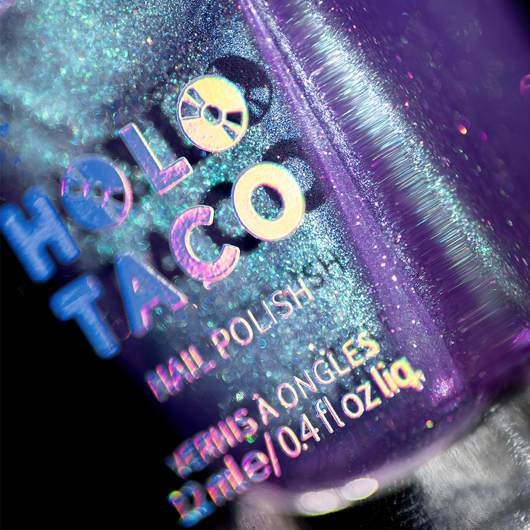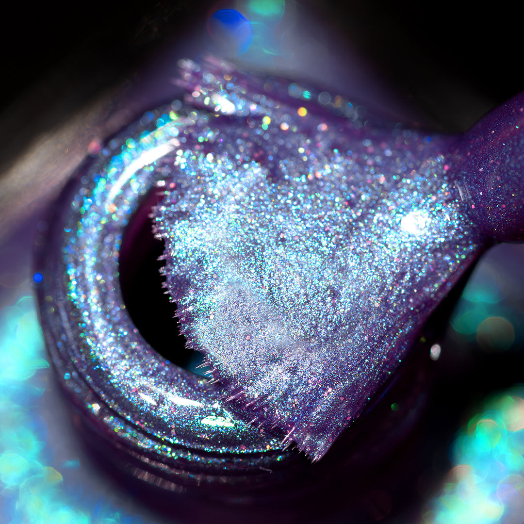 Rodeo meets all-night rave with this striking shimmer. A purple jelly base, lit up with cyan blue micro-shimmer and a dustin’ of scattered holo, this finish glows like the moonlit sky. Saddle up––shimmer just got sultry.