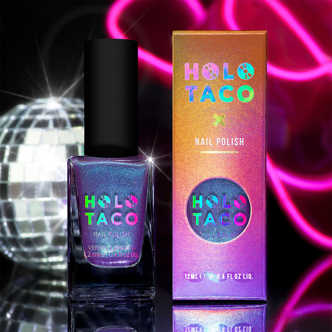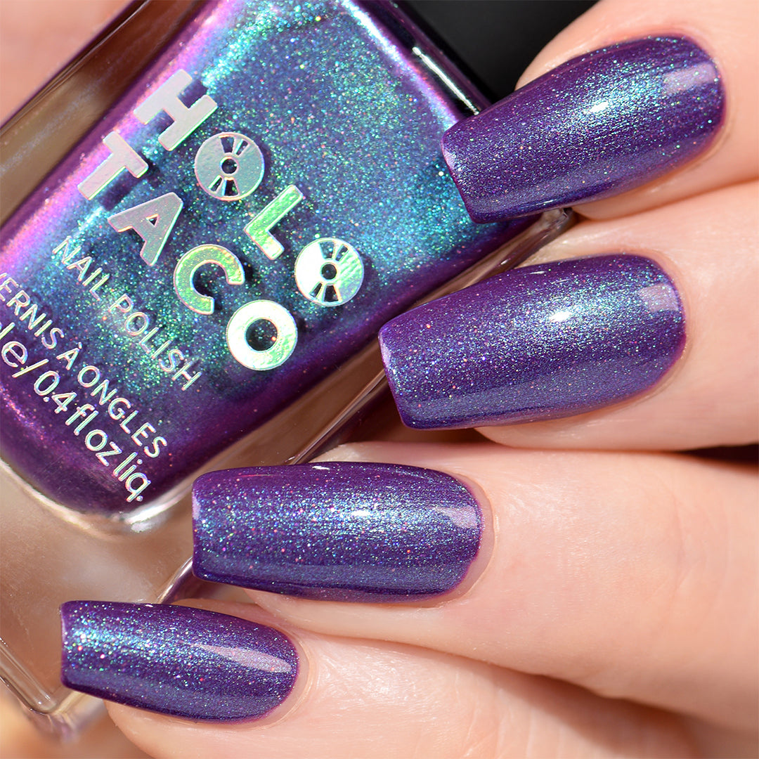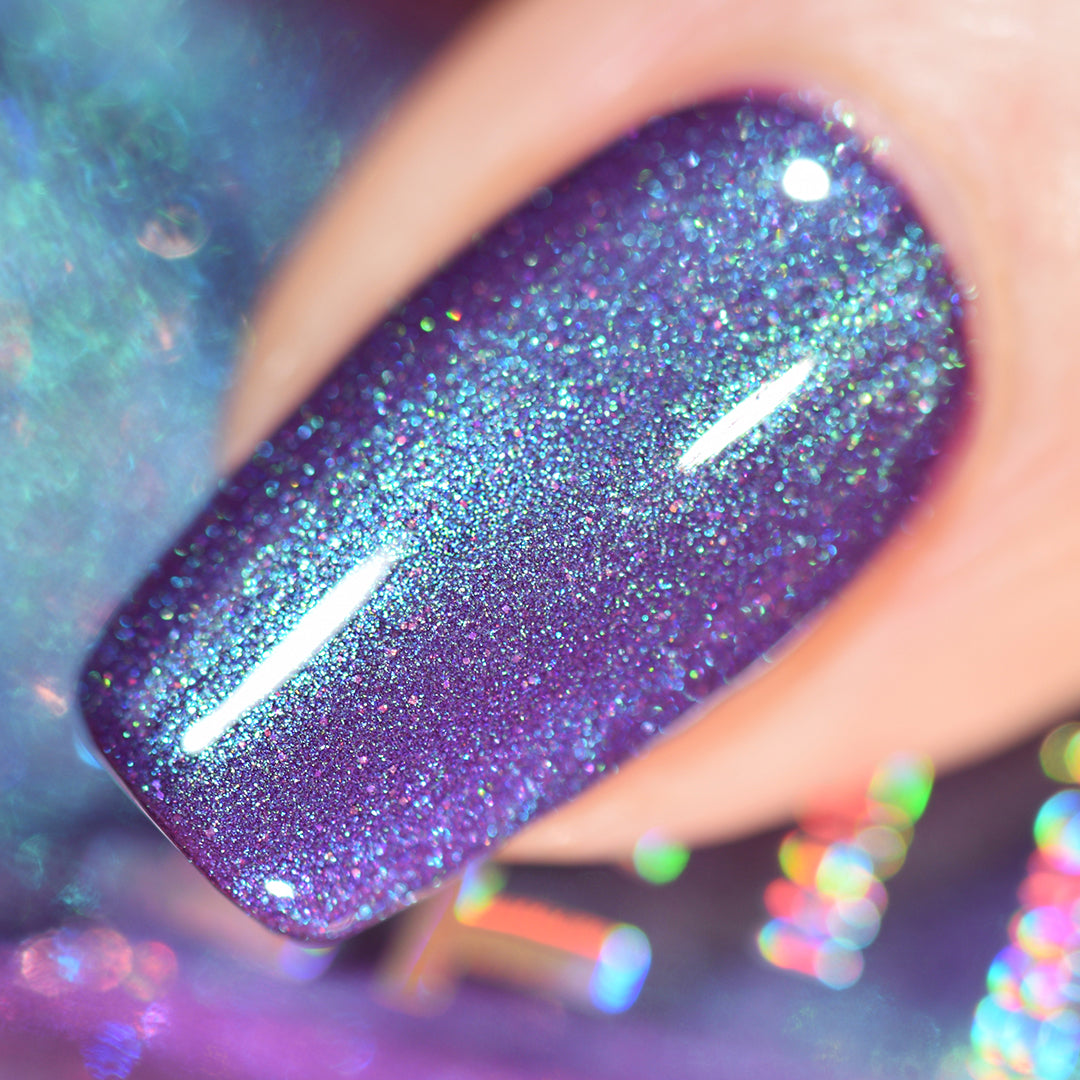 Rodeo meets all-night rave with this striking shimmer. A purple jelly base, lit up with cyan blue micro-shimmer and a dustin’ of scattered holo, this finish glows like the moonlit sky. Saddle up––shimmer just got sultry.