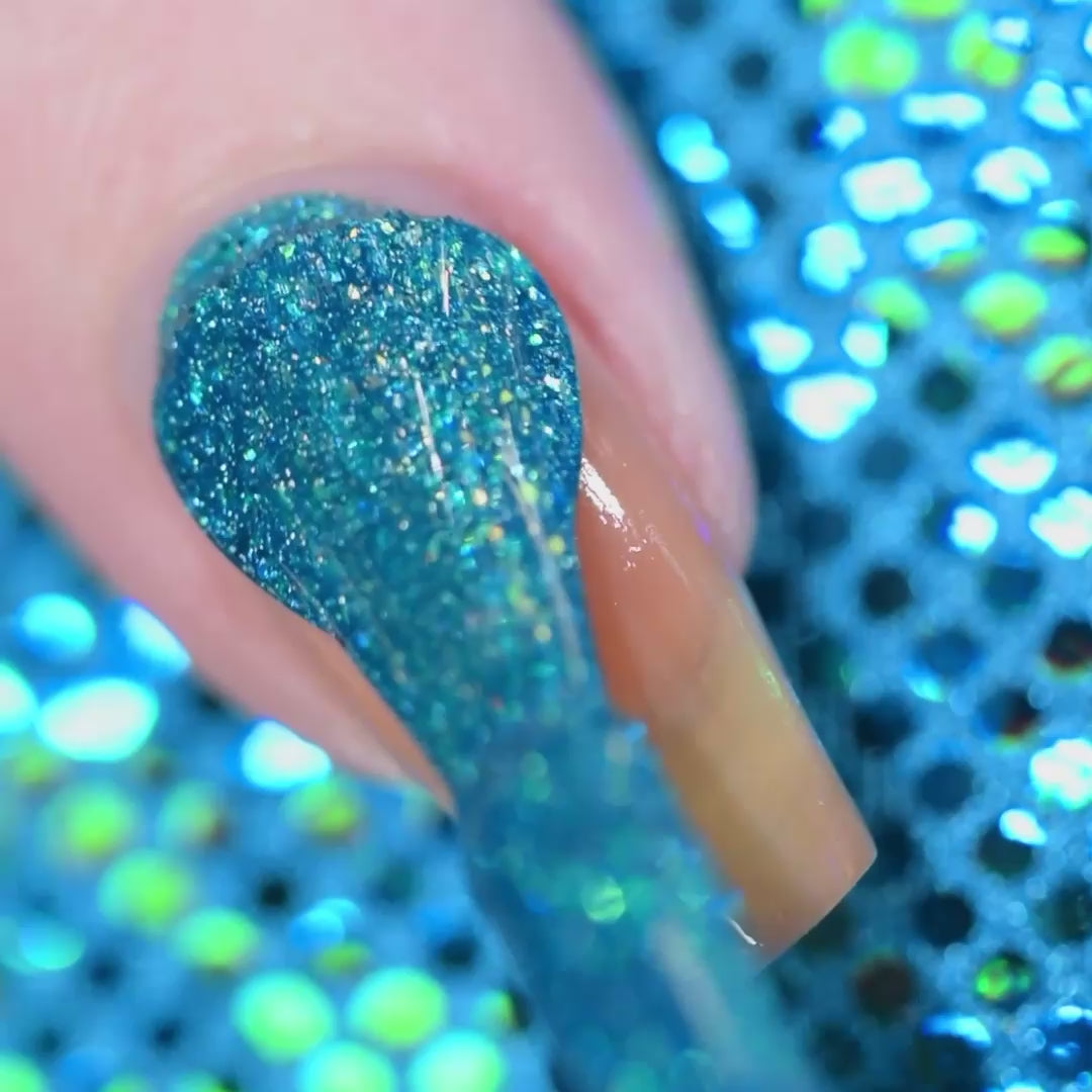 Turquoise jelly polish with iridescent flakes, holographic glitter and crushed holo