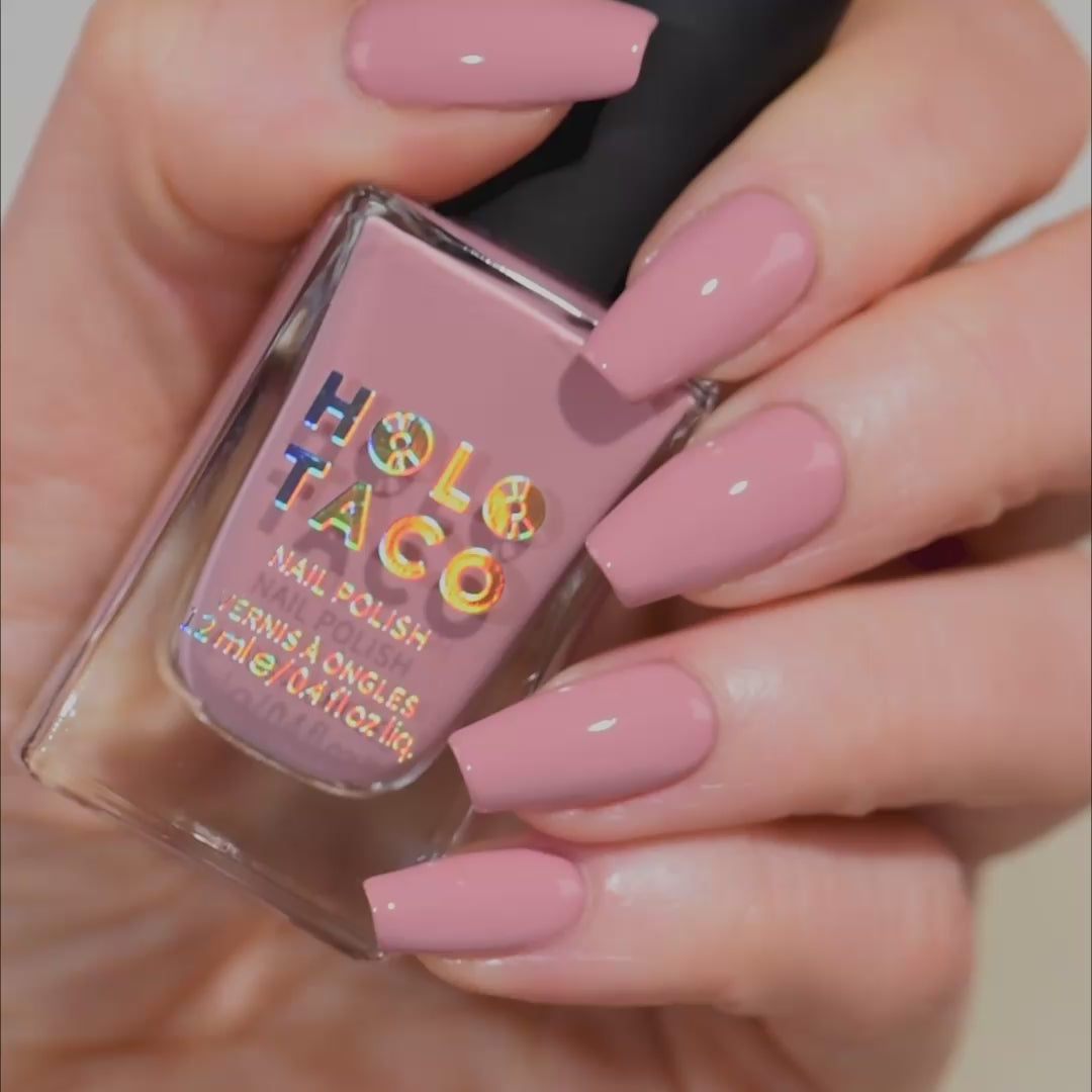 - Muted rose pink polish with a crème formula