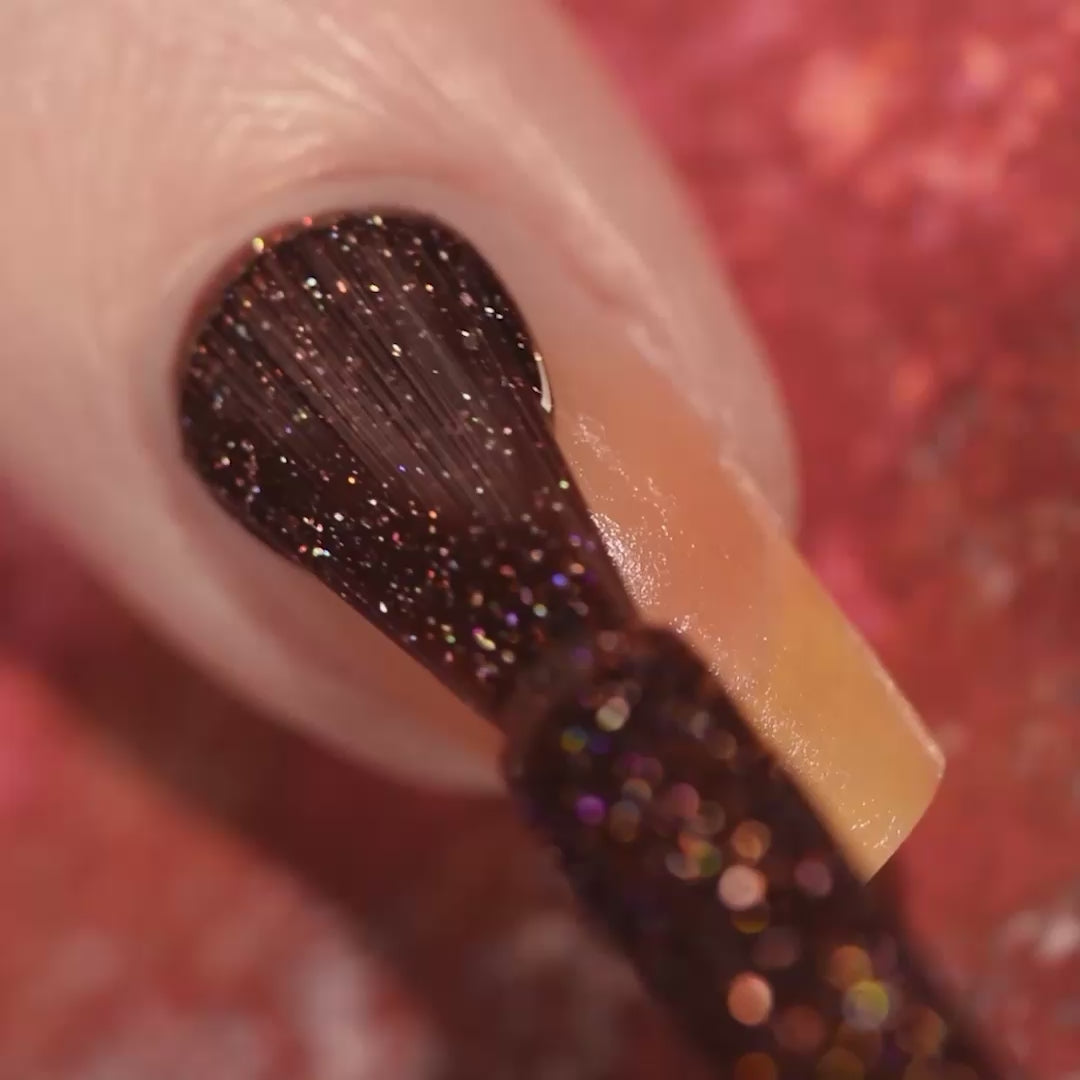 - Crushed holographic formula in a deep burgundy shade