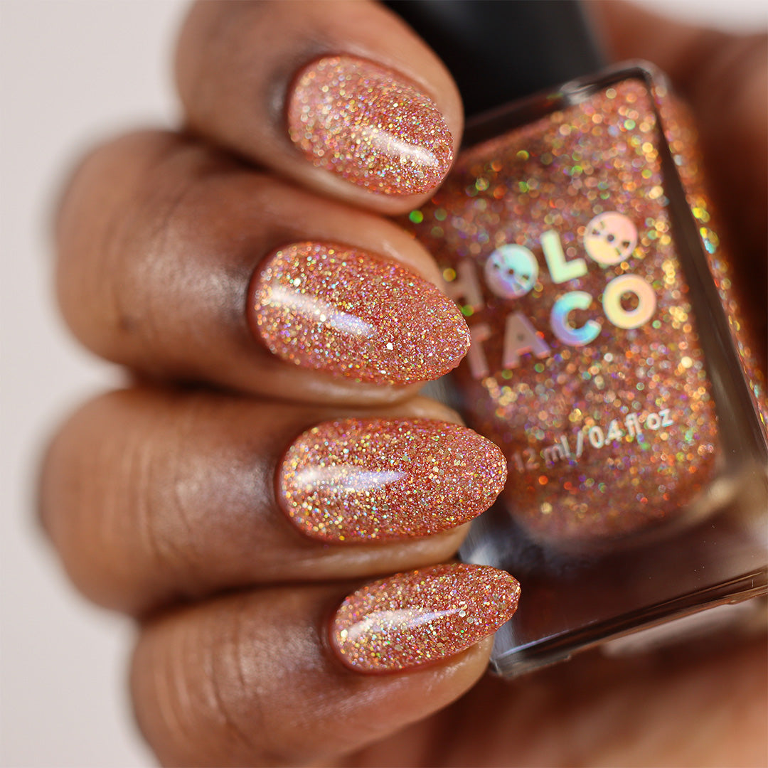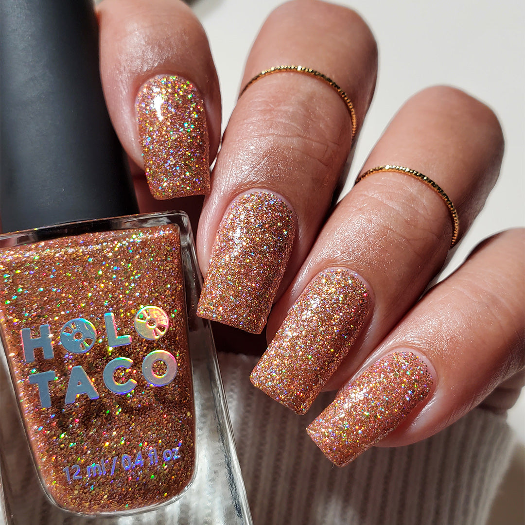 I bought this shade as part of my first Holo Taco order. I love the formula with the slightly larger glitters (compared to Blushed Ice which I also bought). It dries a little lighter in color than I was expecting compared to the pictures but it’s still gorgeous! I thought it would be a good accent color match to pair with a creme polish like Brick Wall based on pictures but it matched better with Ginger Snatched.