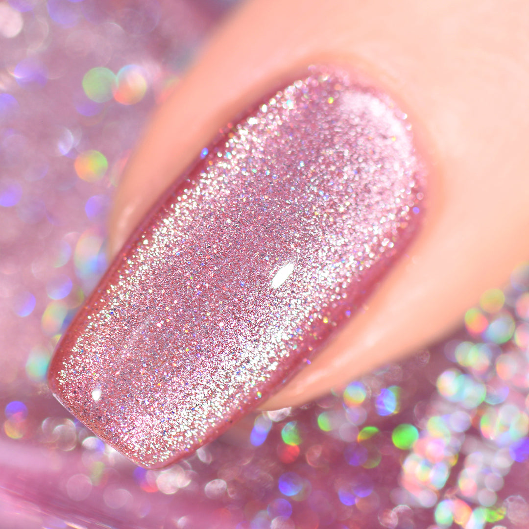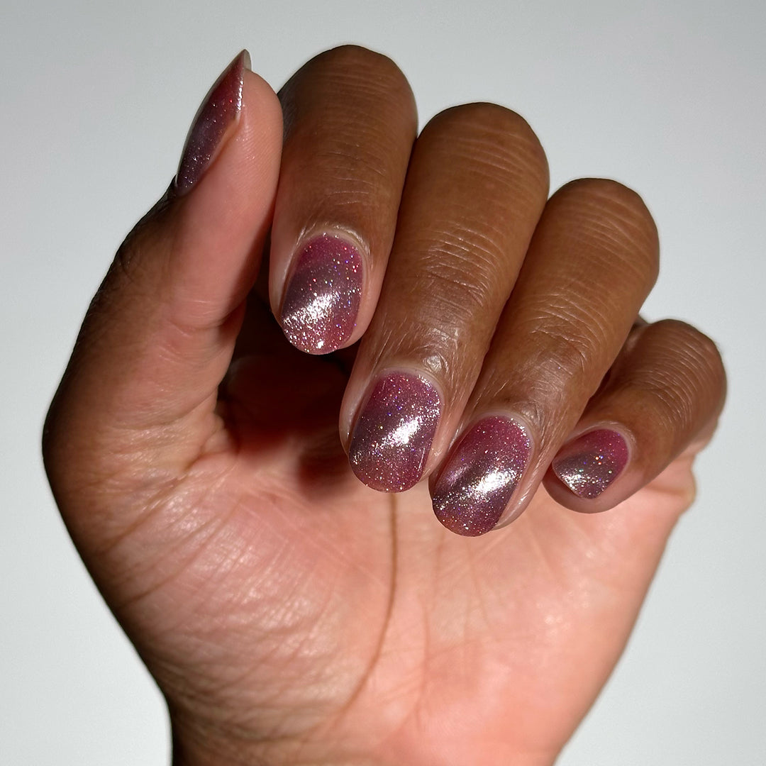 - Magnetic polish with a baby pink base, icy pale pink magnetic pull and scattered holo