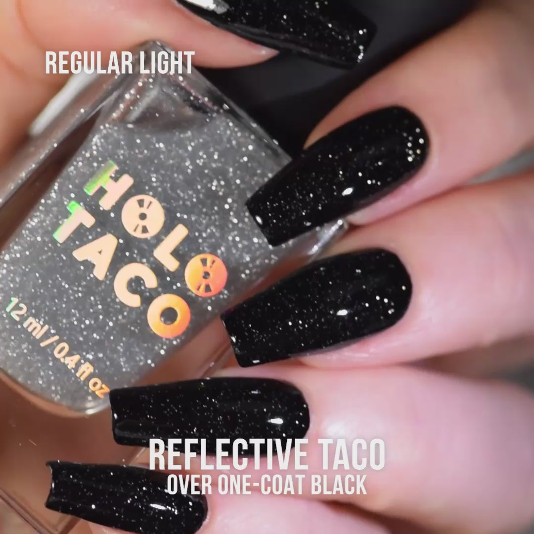 I love just how much of a bling factor there is and this topper even works great for nail art, I made lines with another polish and then filled in the gaps with reflective taco to make everything the same level again and it turned out so pretty in all lighting