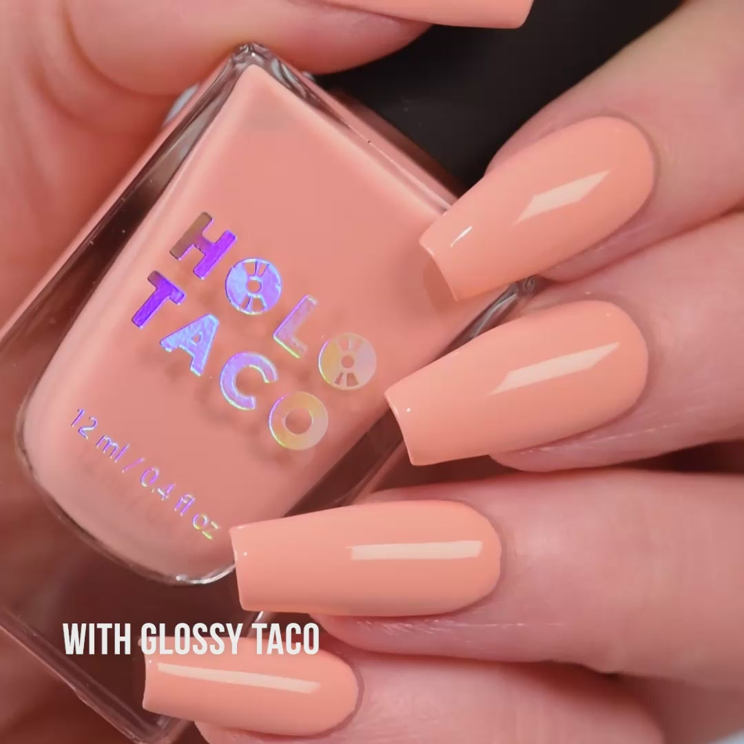 - Note: Super-pigmented shades like this one may cause staining depending on the porousness of the nail and the use of a protective base coat. Swatch photos as pictured have one coat of Glossy Taco for optimal smoothness and shine.