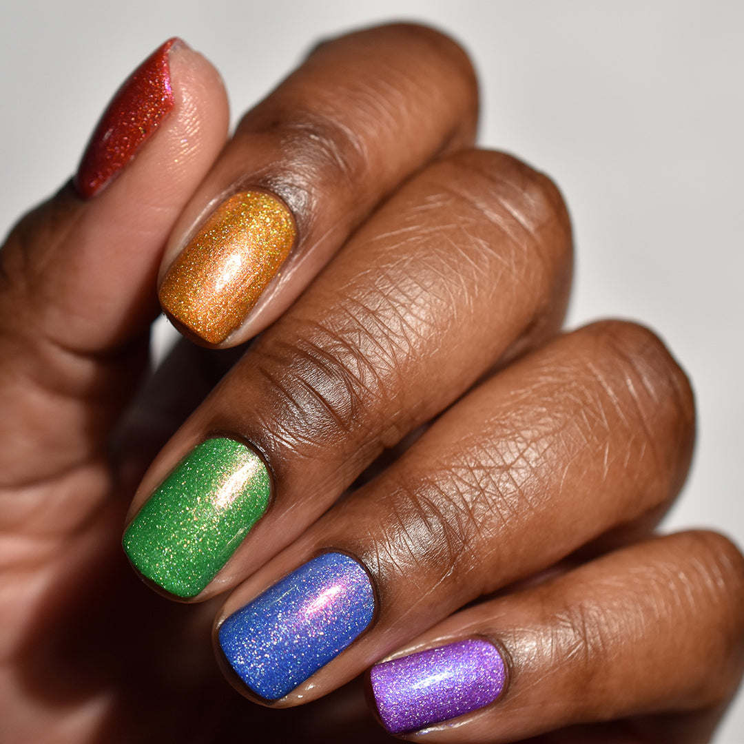 - Note: Holographic nail polish shows best under direct sunlight, halogen bulbs, or just your phone camera flash!