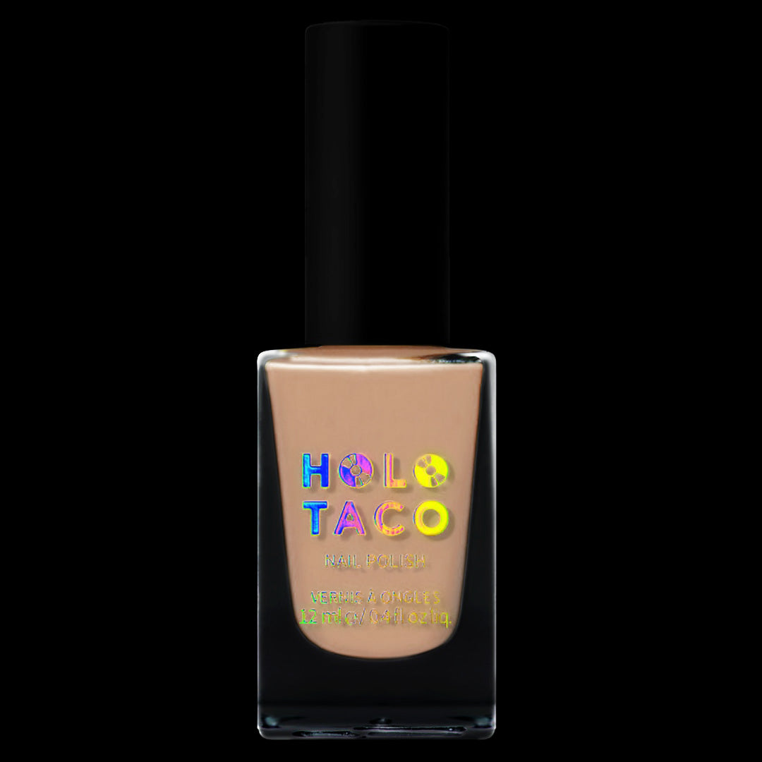 I love this polish! It suits my warm-toned skin so well and it perfectly replicates a chai latte shade. The formula is smooth as can be, great coverage, not streaky at all, and the colour looks especially good under a Lunar Unicorn Skin and optional Matte Taco (pictured here alongside a Beach Please accent ring finger). Thanks Holo Taco for spilling the tea!