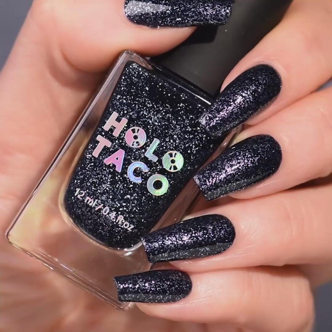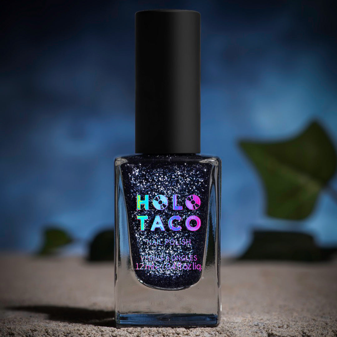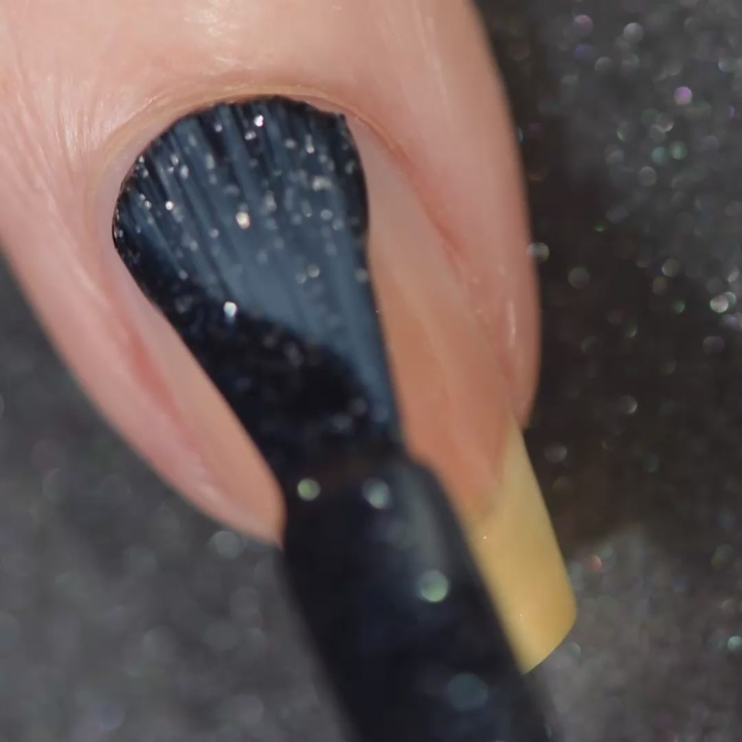 - Deep muted navy frosted metal formula with silver foil flakes