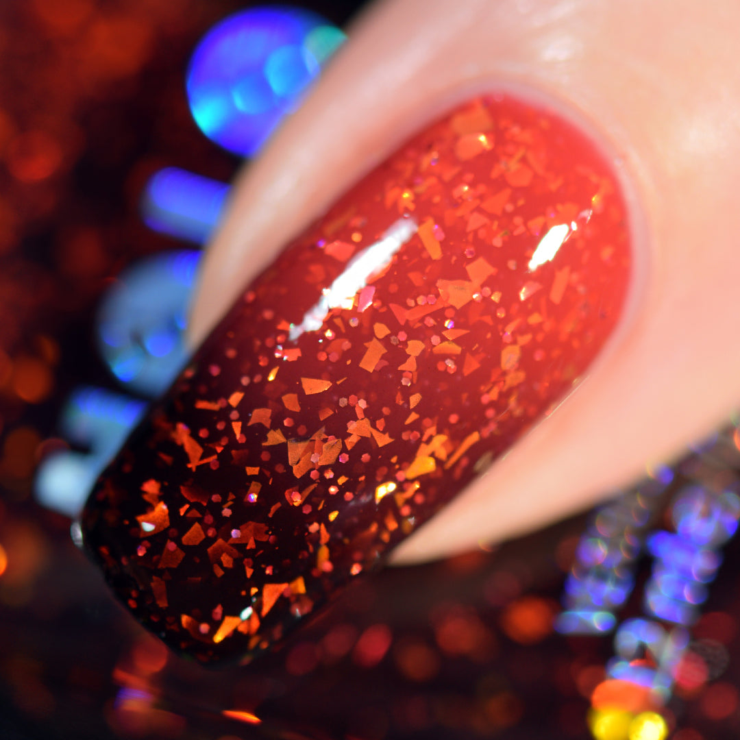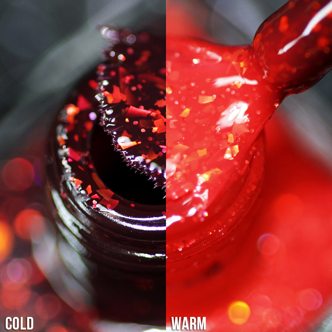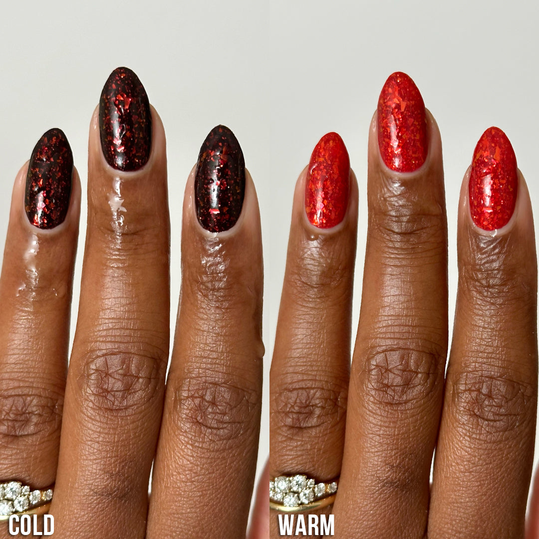 Blackened-burgundy (cool state) to bright red (warm state) thermal polish with red iridescent flakes and scattered holo that changes colours depending on the temperature