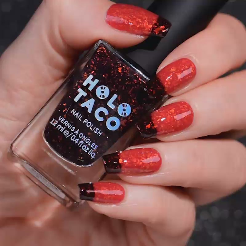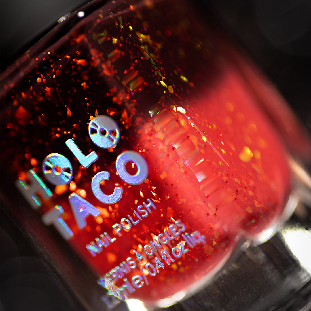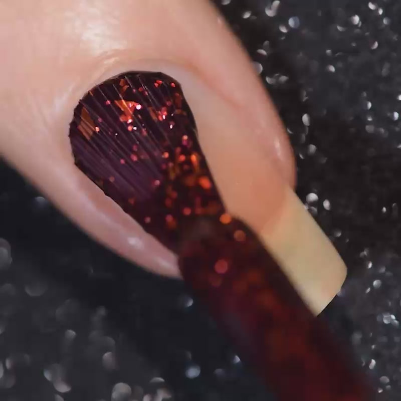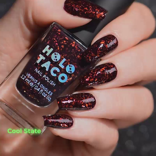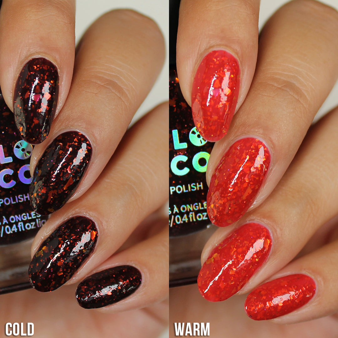 Blackened-burgundy (cool state) to bright red (warm state) thermal polish with red iridescent flakes and scattered holo that changes colours depending on the temperature