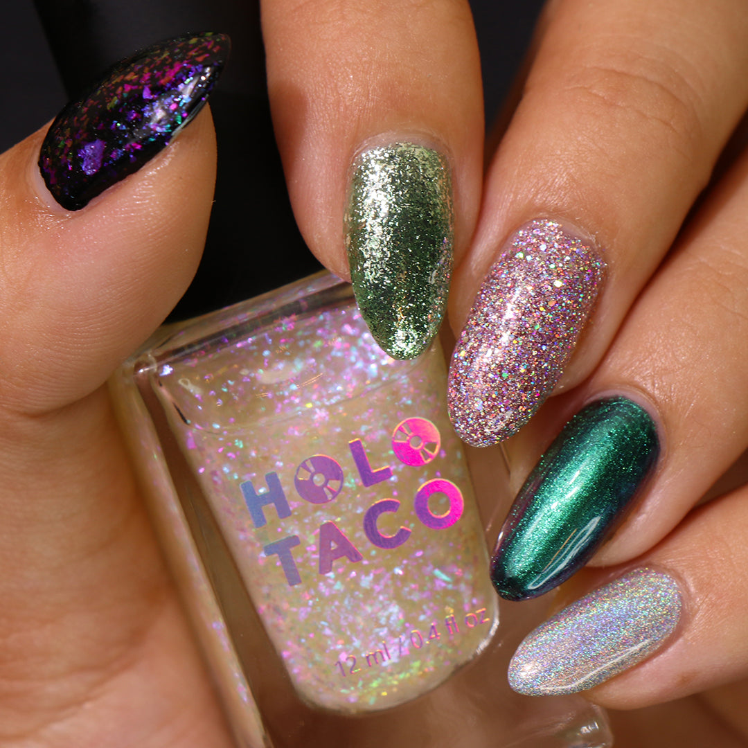 This bundle was my first Holo Taco experience; I love these colors! One Coat Black is exactly as it says, and the Aurora Unicorn Skin on top is so pretty! I used a different brand base and top coat but I painted my nails Saturday night and didn't get any significant chipping until Thursday, and that's only on my thumbs. I'll be buying more colors in the future!