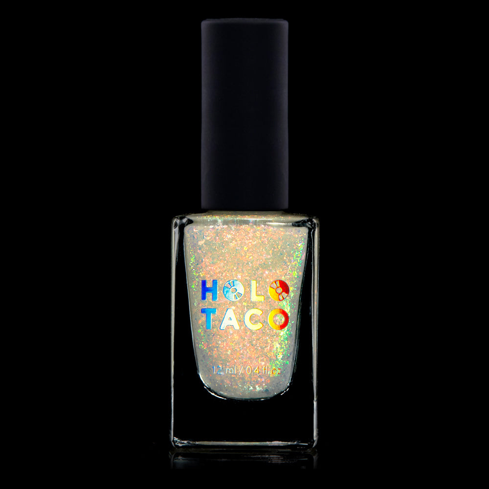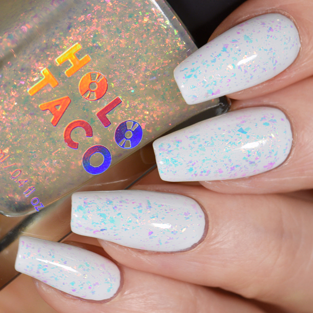 • Note: Iridescent top coats show differently over different base colours and under different lighting conditions. A camera flash or direct lighting will showcase the dominant colour of the iridescent flakie and indirect lighting (or shade) will reveal the secondary shifts in colour! Swatch photos as pictured have one coat of Glossy Taco for optimal smoothness and shine.