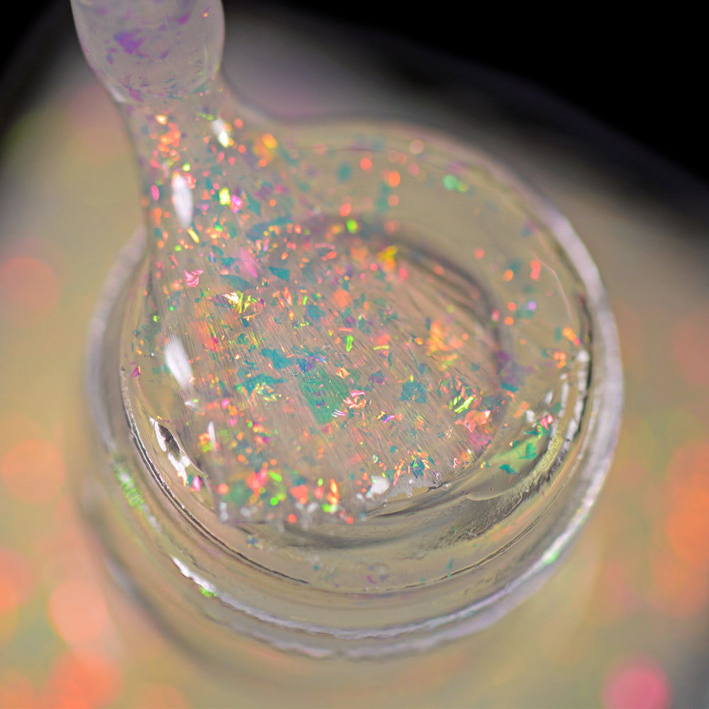 Lit up like the sun! This iridescent flakie topper transforms your nails like glowing fire embers. Over a dark base, the translucent asymmetrical flakies will shift in colour from a vibrant red-orange to a glowing yellow-green. Over a light base, they appear pink and cyan blue. Solar system who?