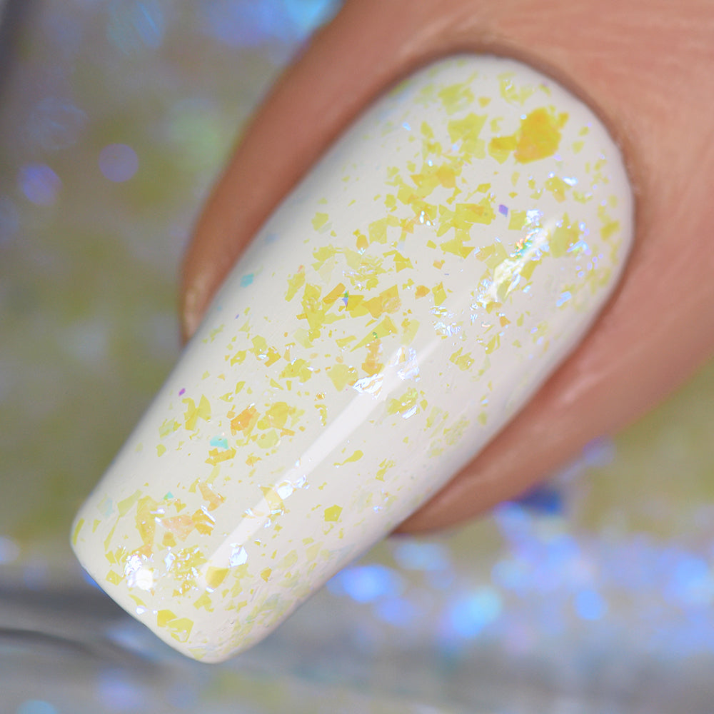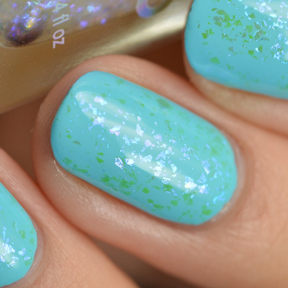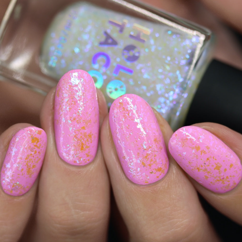 • Note: Iridescent toppers show differently over different base colours and under different lighting conditions. A camera flash or direct lighting will showcase the dominant colour of the iridescent flakie and indirect lighting (or shade) will reveal the secondary shifts in colour! Swatch photos as pictured have one coat of Glossy Taco for optimal smoothness and shine.