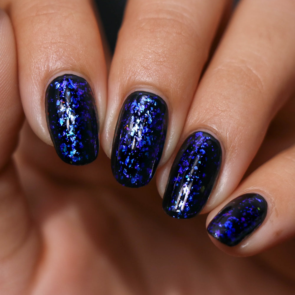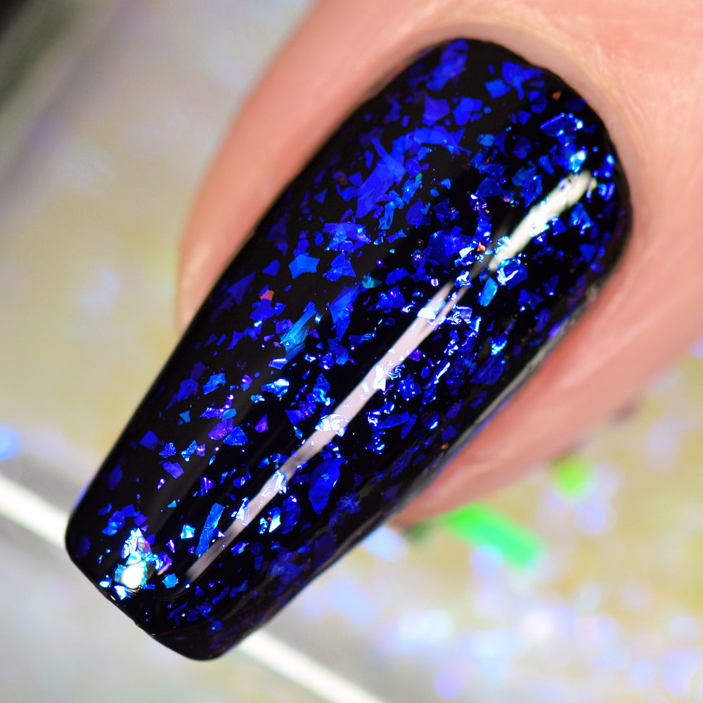 • Iridescent colour-shifting nail polish toppers packed with translucent flakies in a clear base. Flakies are predominantly blue and shift to yellow. The final colour effect changes depending on the base polish colour worn underneath.