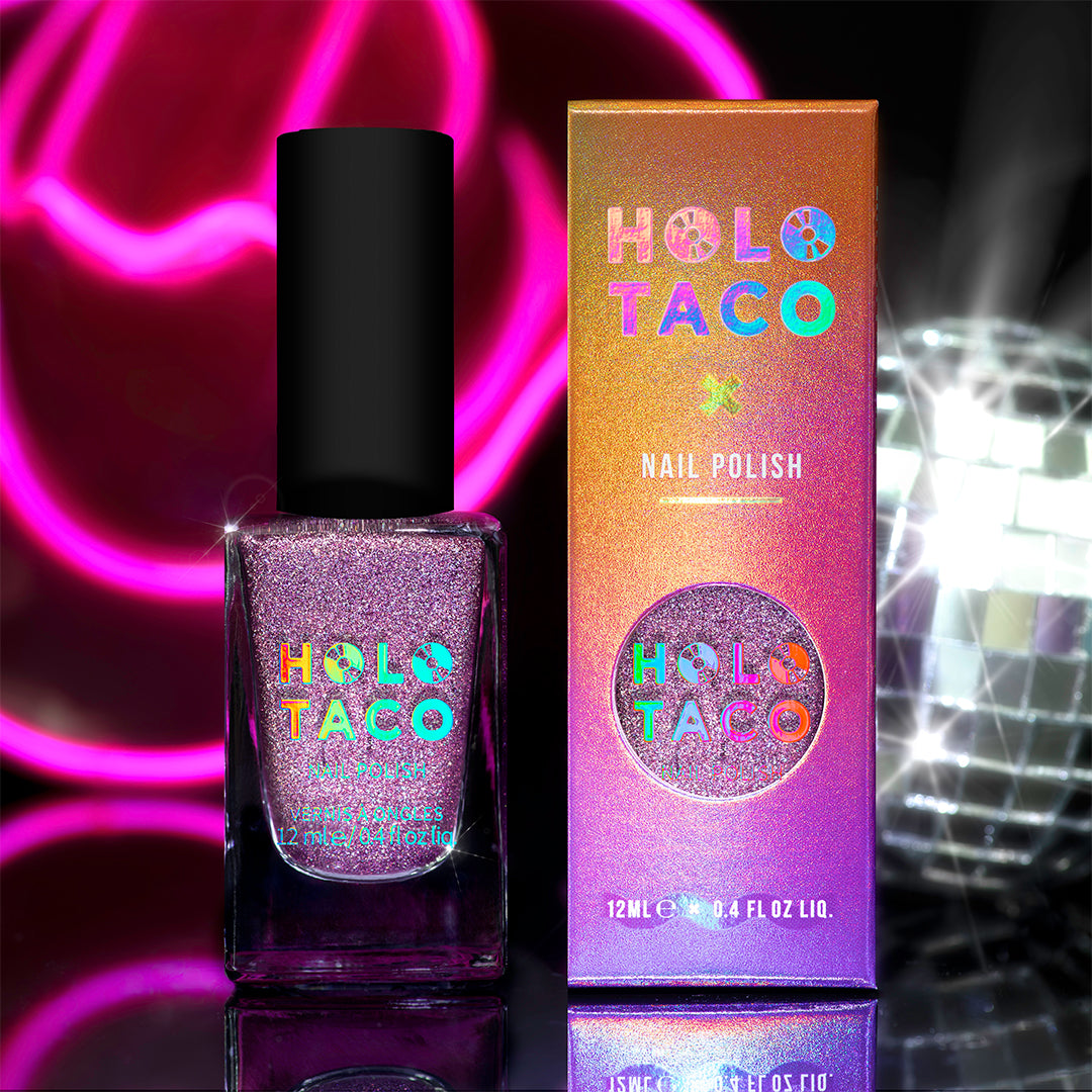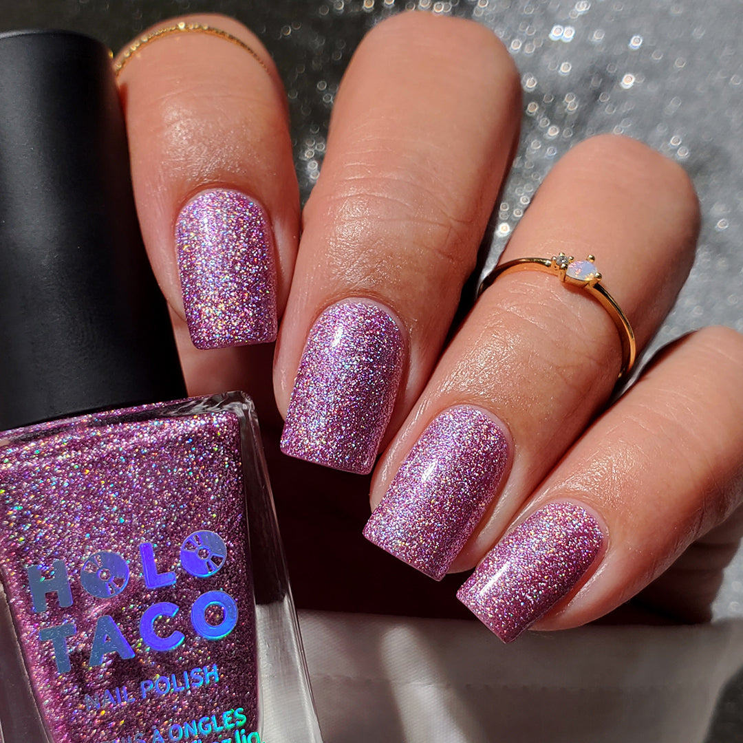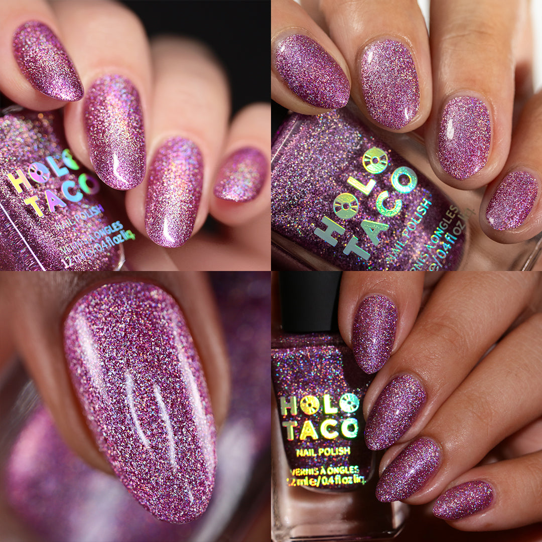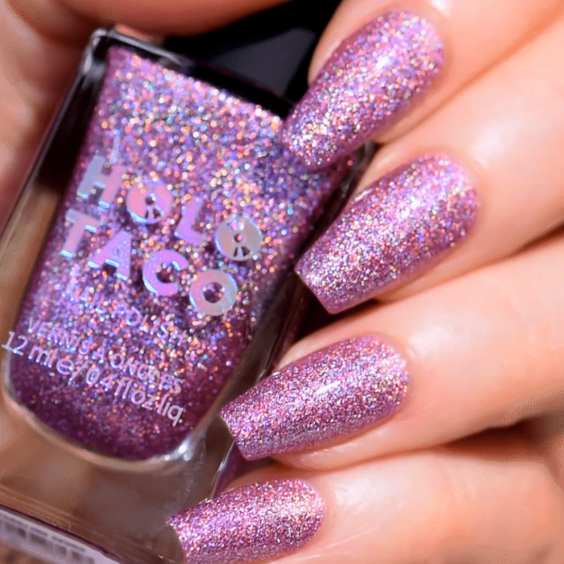 Note: Holographic nail polish shows best under direct sunlight, halogen bulbs, or just your phone camera flash! Swatch photos as pictured have one coat of Glossy Taco.