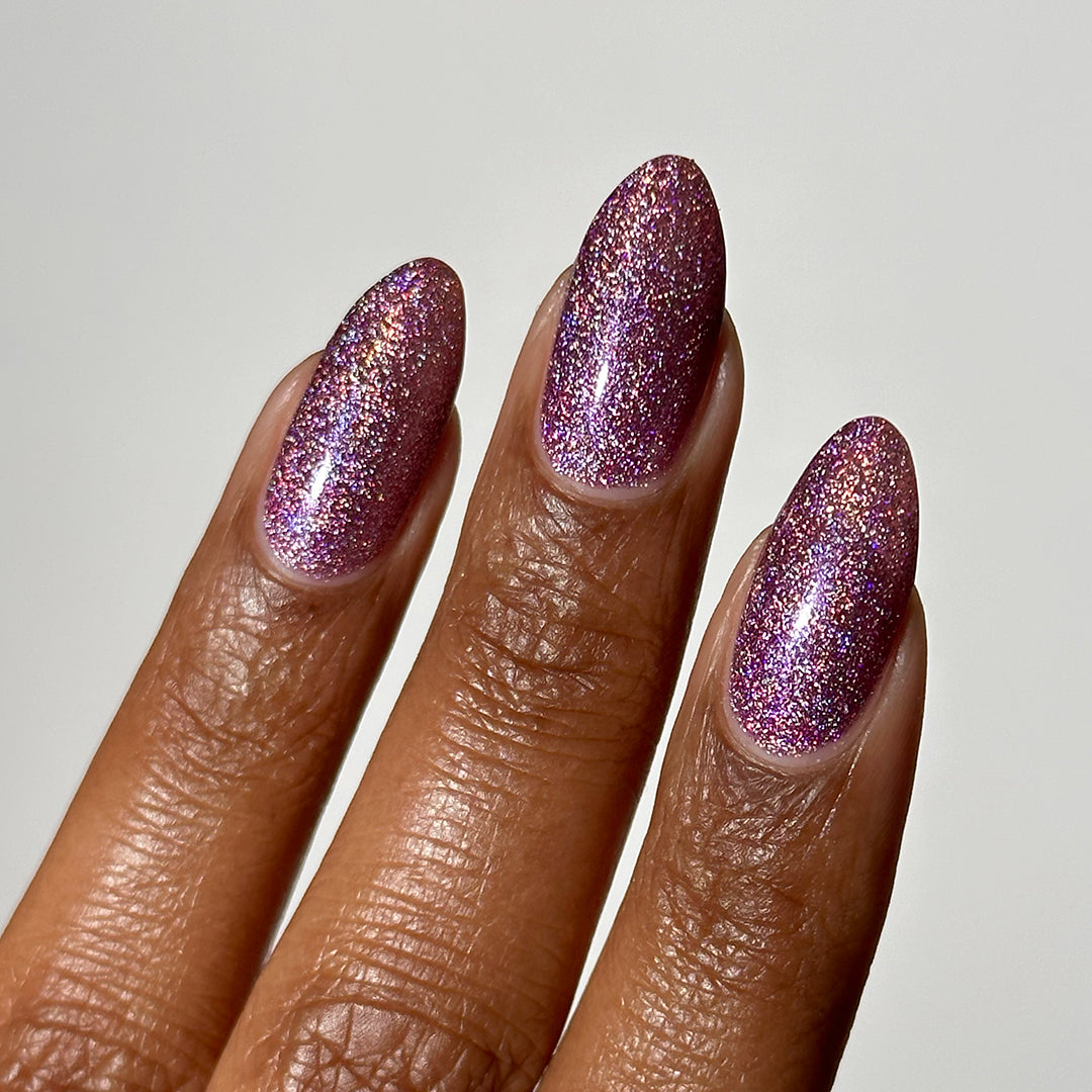 A lilac purple with a whole lotta *kick*. This crushed holographic polish catches more light (and compliments) than rhinestone boots at a disco. Don’t be surprised if it outshines the rest of your fit.