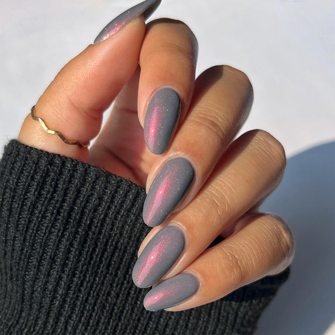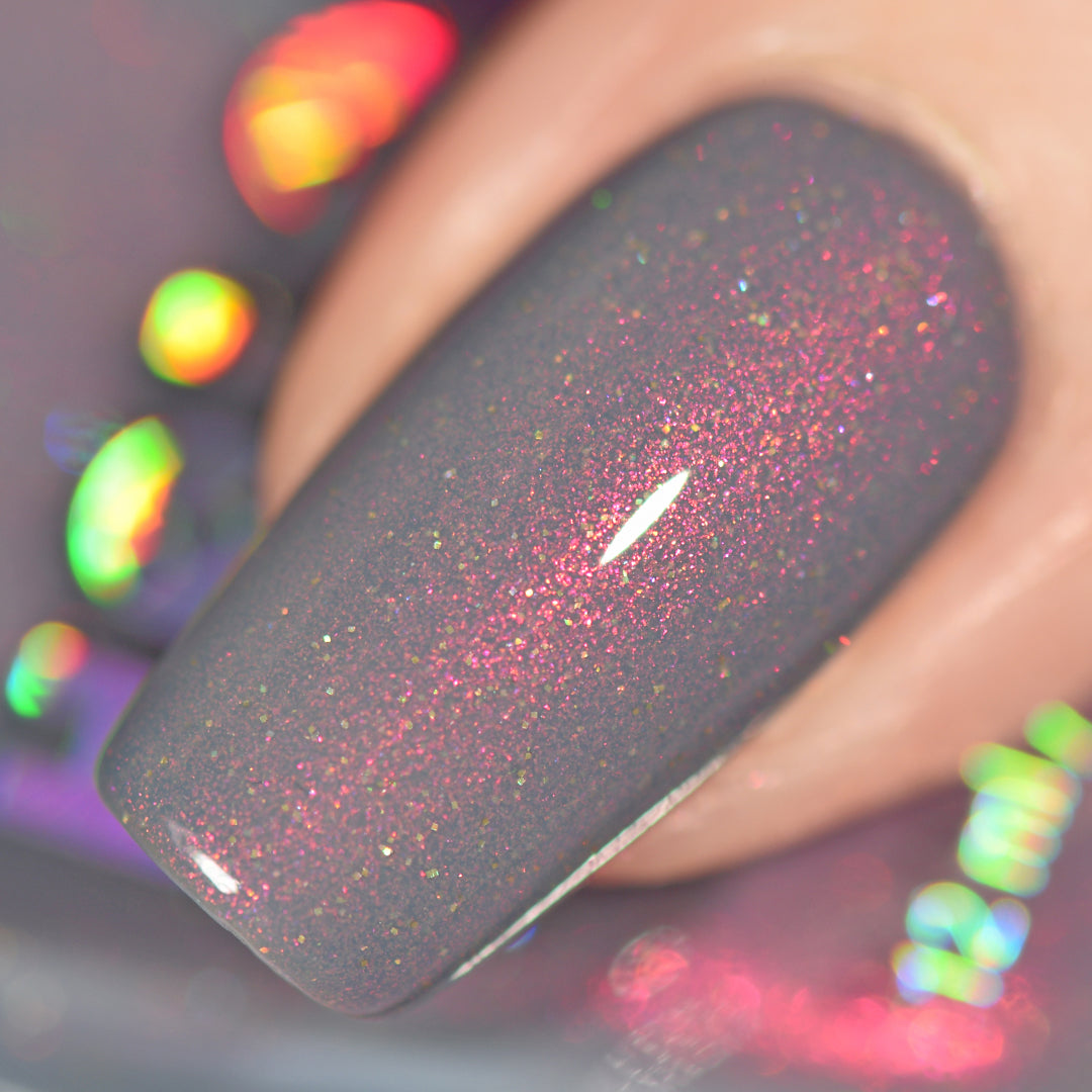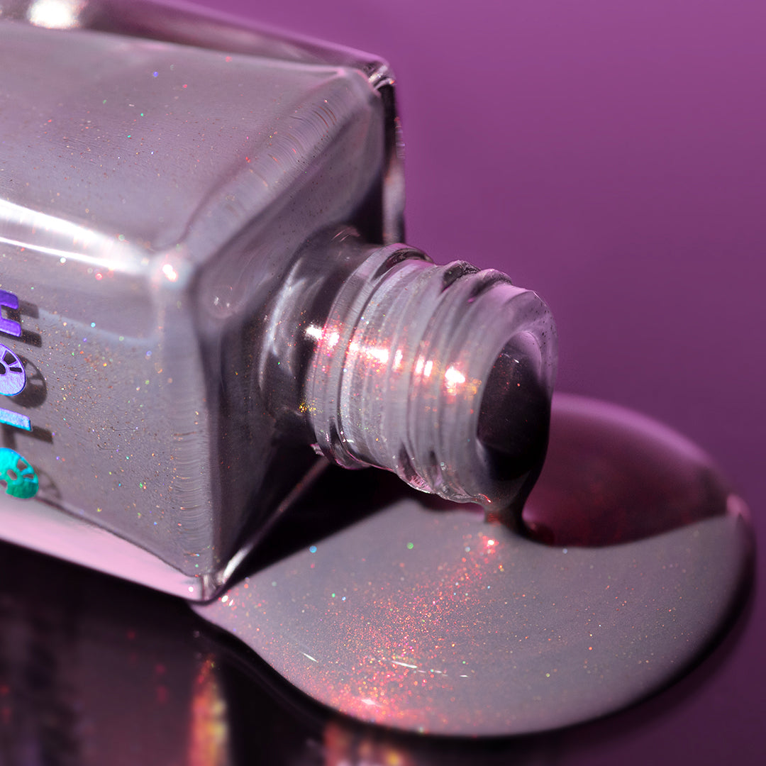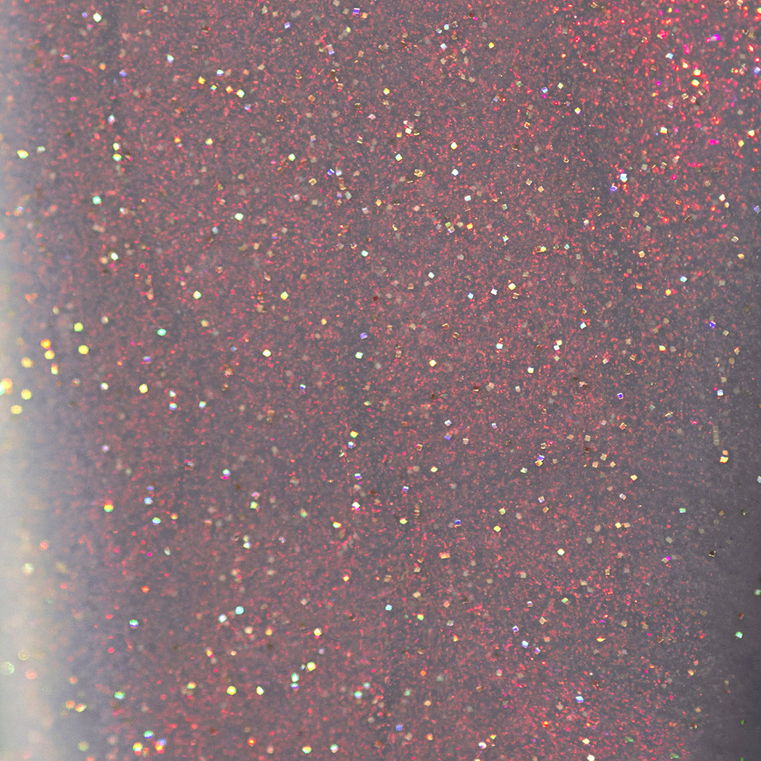 - Cool grey jelly formula with a magenta-red shimmer and a dash of scattered holo