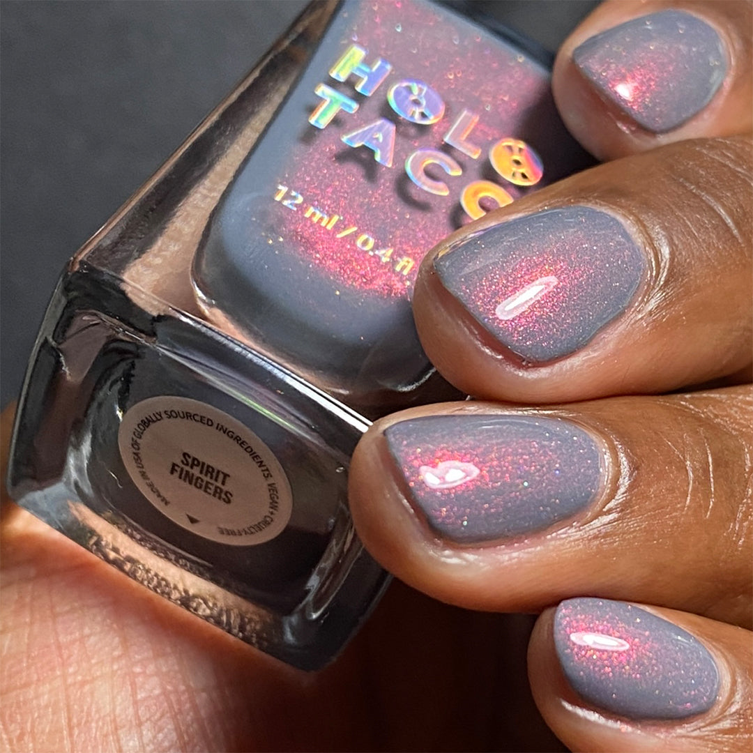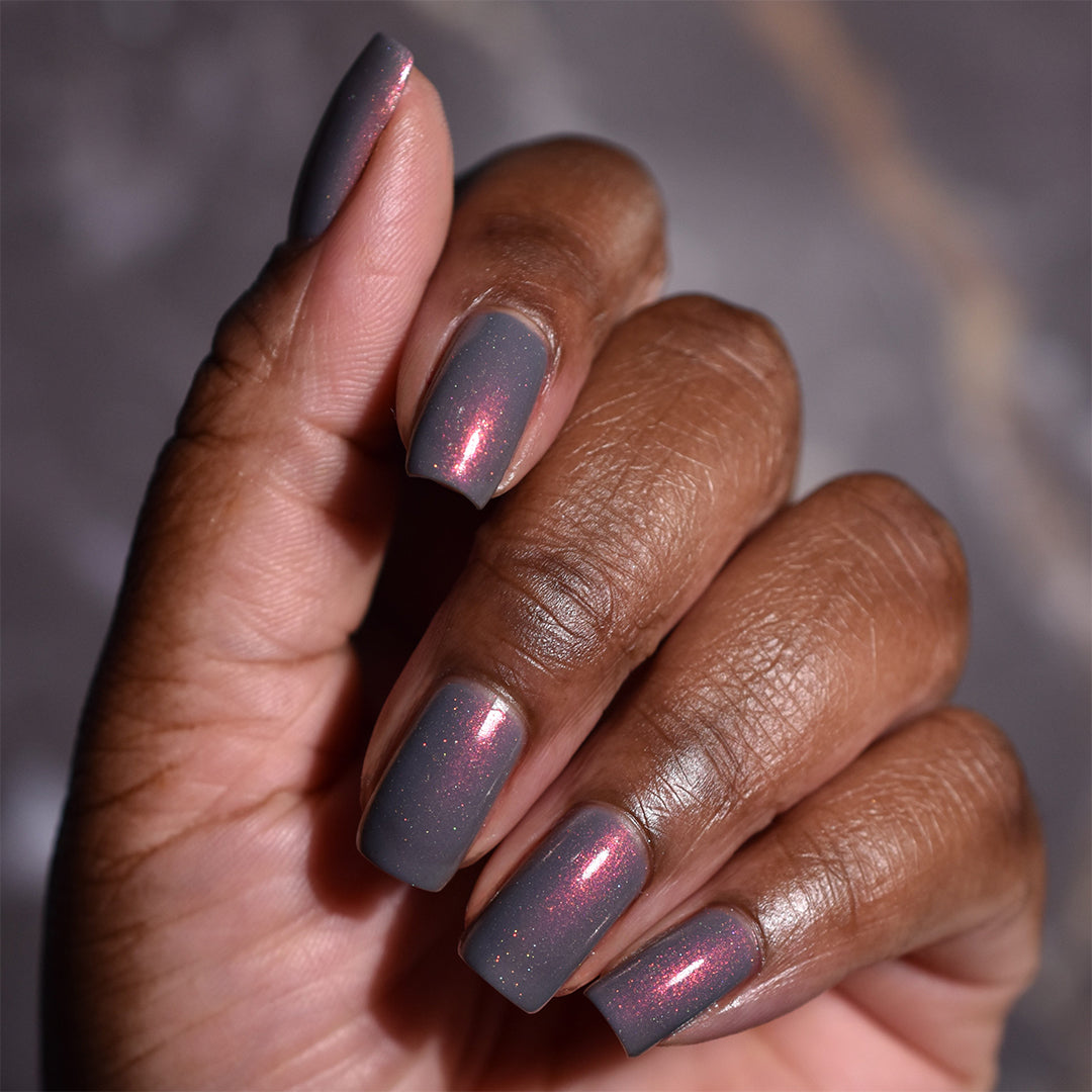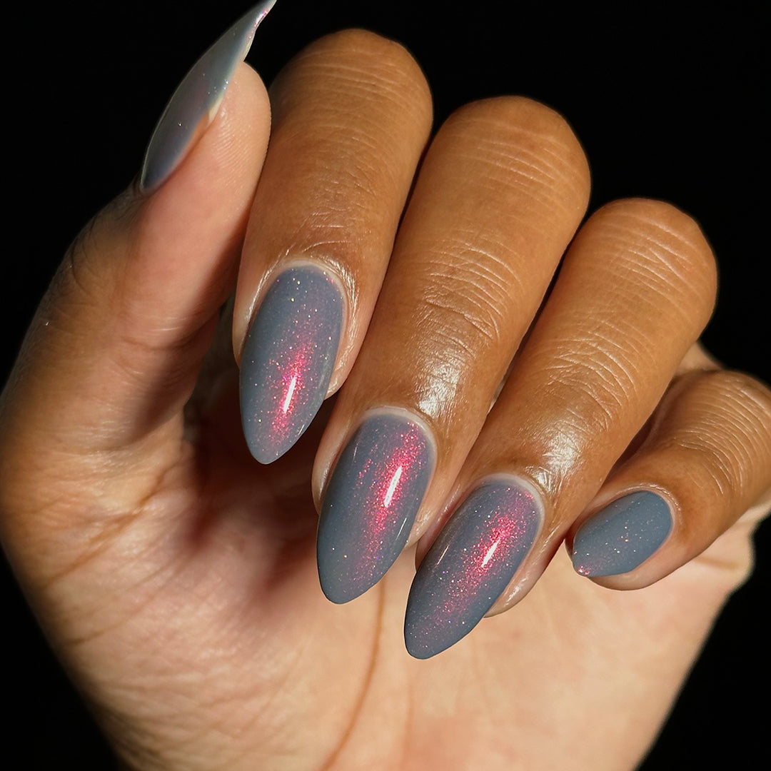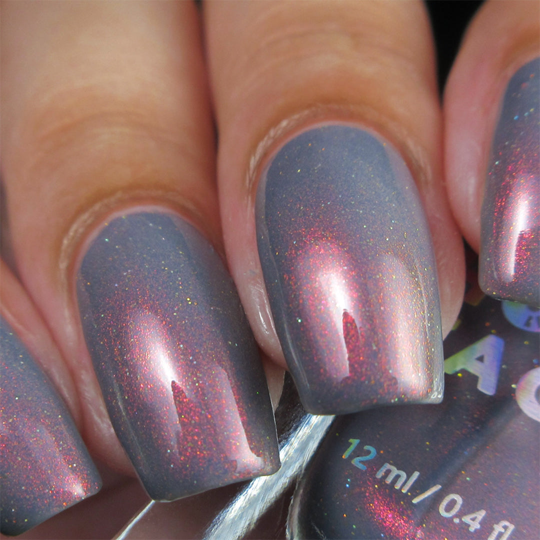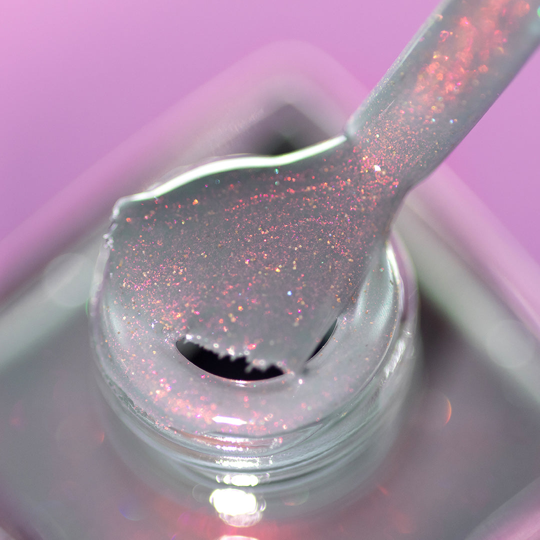 - Cool grey jelly formula with a magenta-red shimmer and a dash of scattered holo
