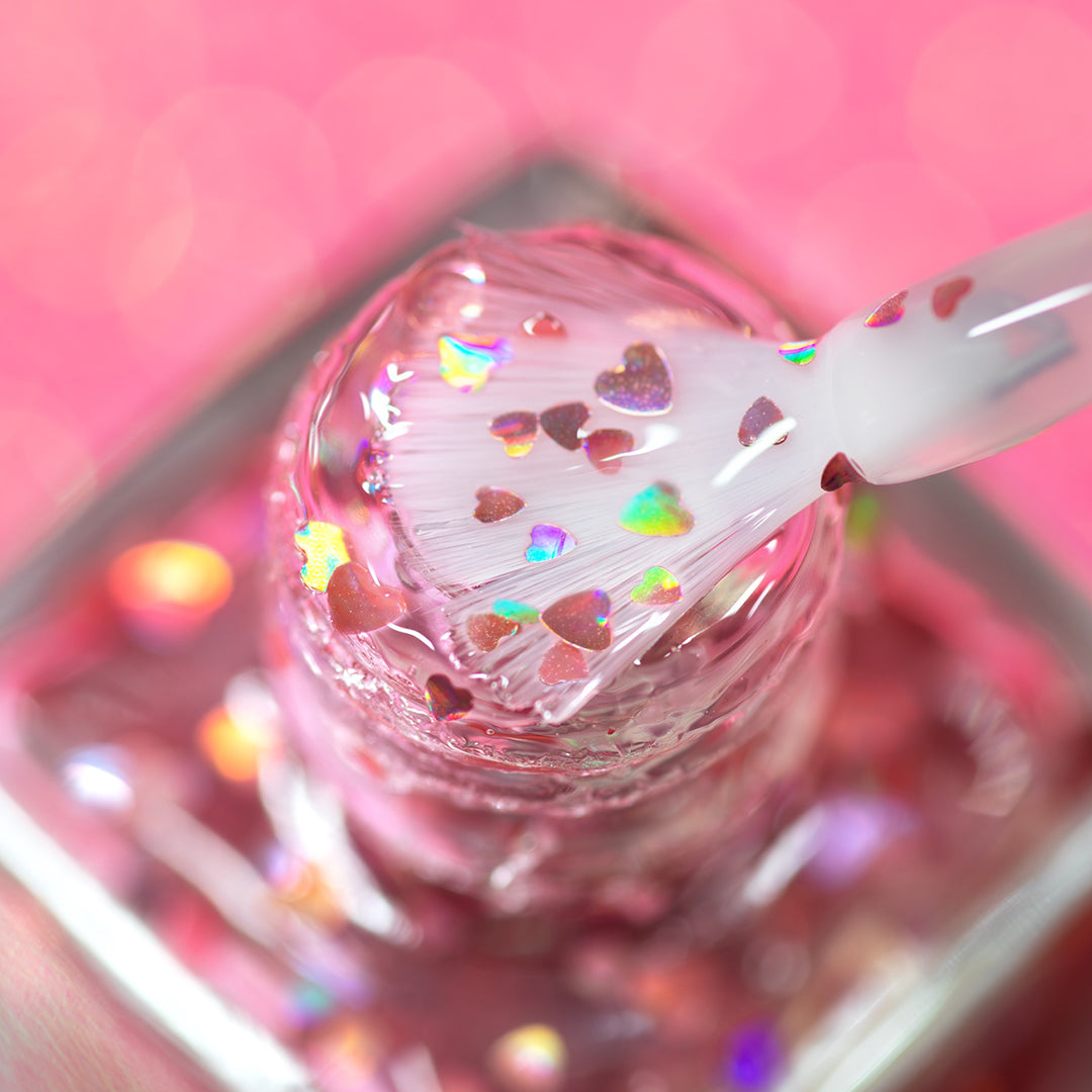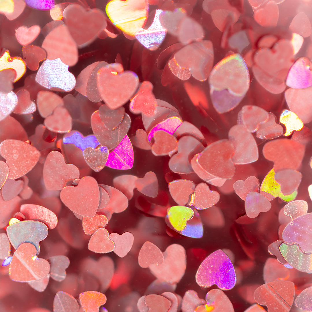 - Small and mini pink holographic heart-shaped glitters in a clear base.