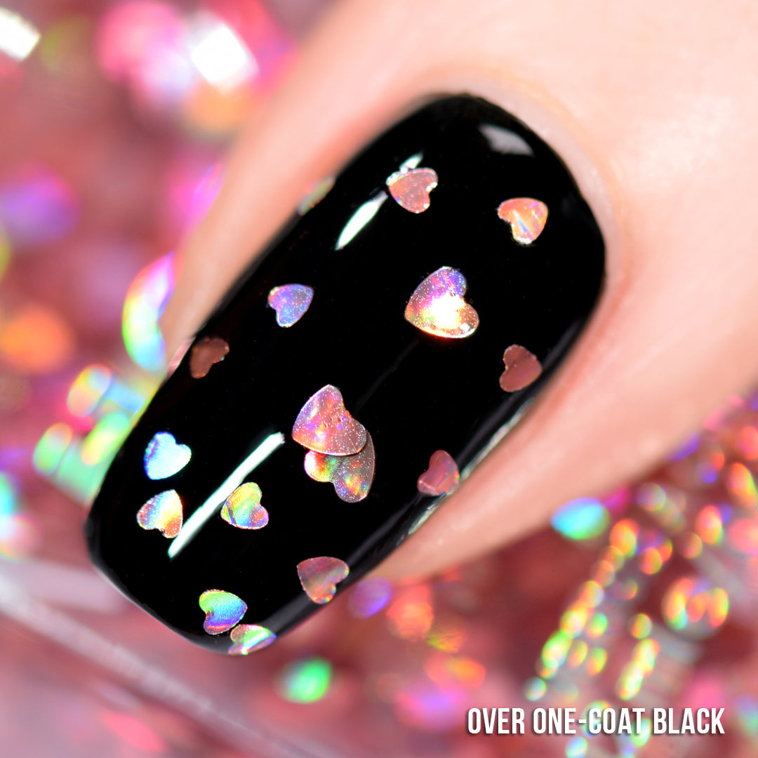 - Whole-hearted tip: for more precise heart placement, carefully place additional heart glitters one by one (with the brush end, toothpick or ball-tipped nail tool) immediately after applying one coat of the topper.