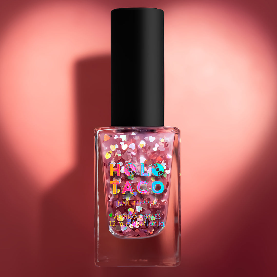 Show your love of holo with Sweetheart Taco. A cascade of pink holo hearts that sparkle with every glance.