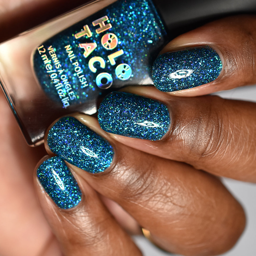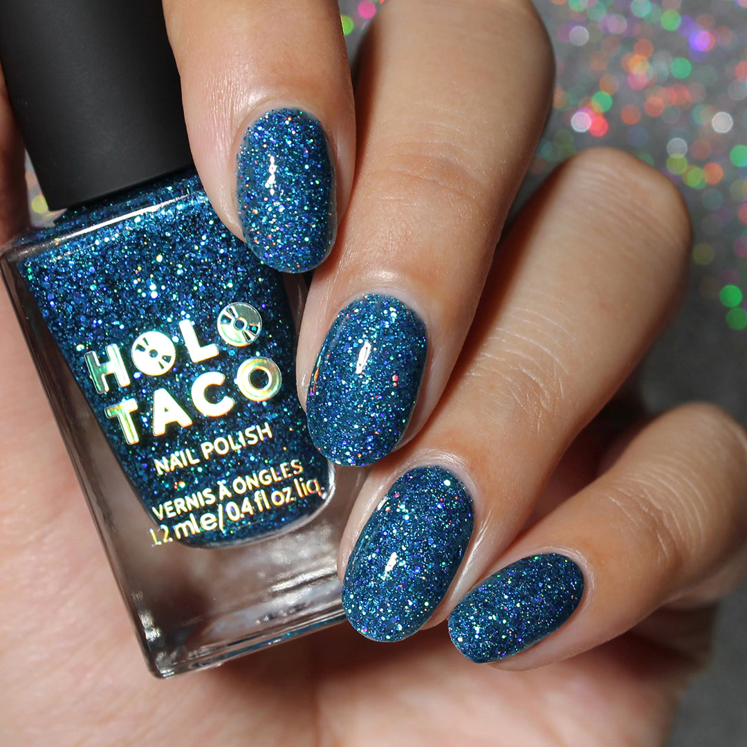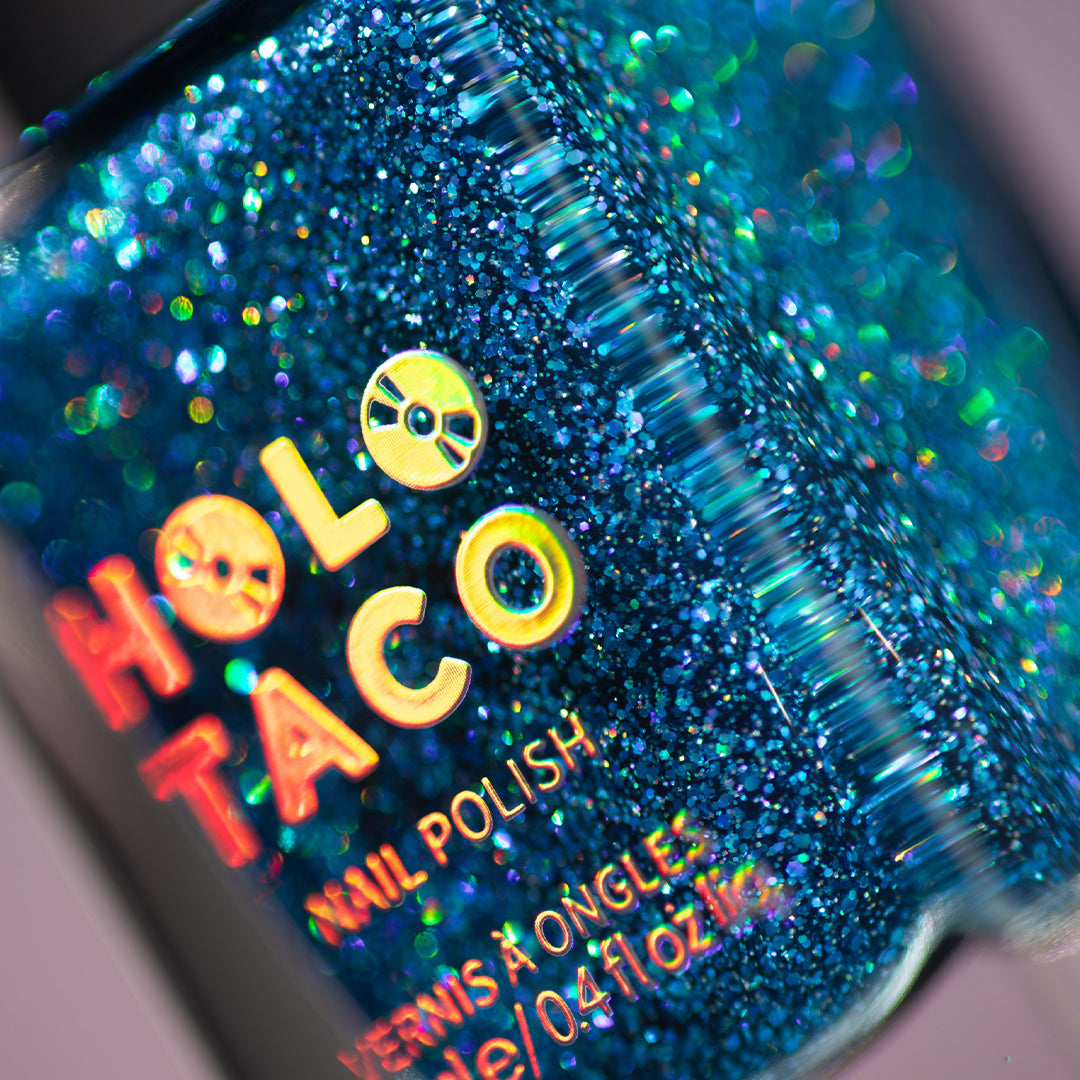 Note: Holographic nail polish shows best under direct sunlight, halogen bulbs, or just your phone camera flash! Swatch photos as pictured have one coat of Glossy Taco for optimal smoothness and shine. Super-pigmented shades may cause staining depending on the porousness of the nail and the use of a protective base coat. Polish should be stored in a cool, dark place to keep it at its best for longer and to prevent the colour or consistency from changing.