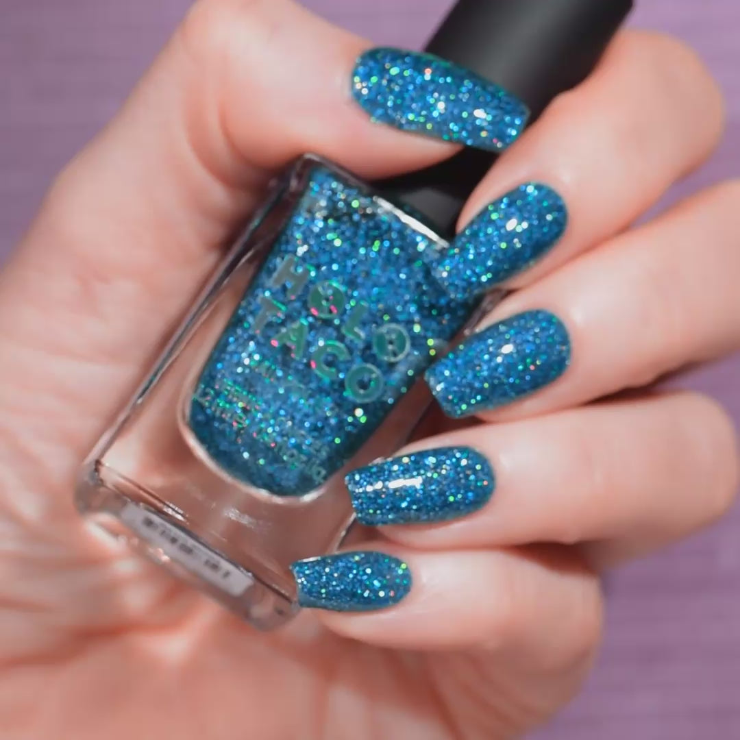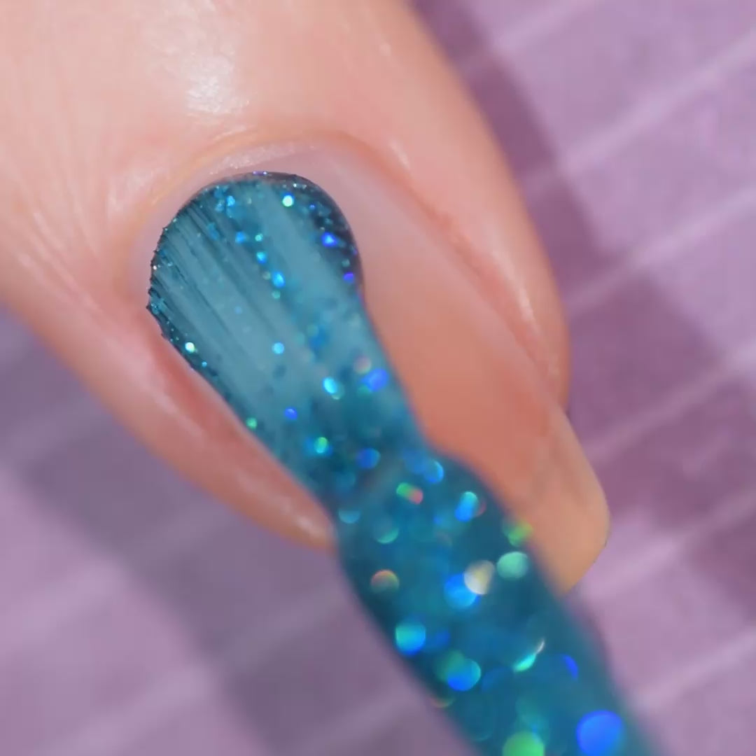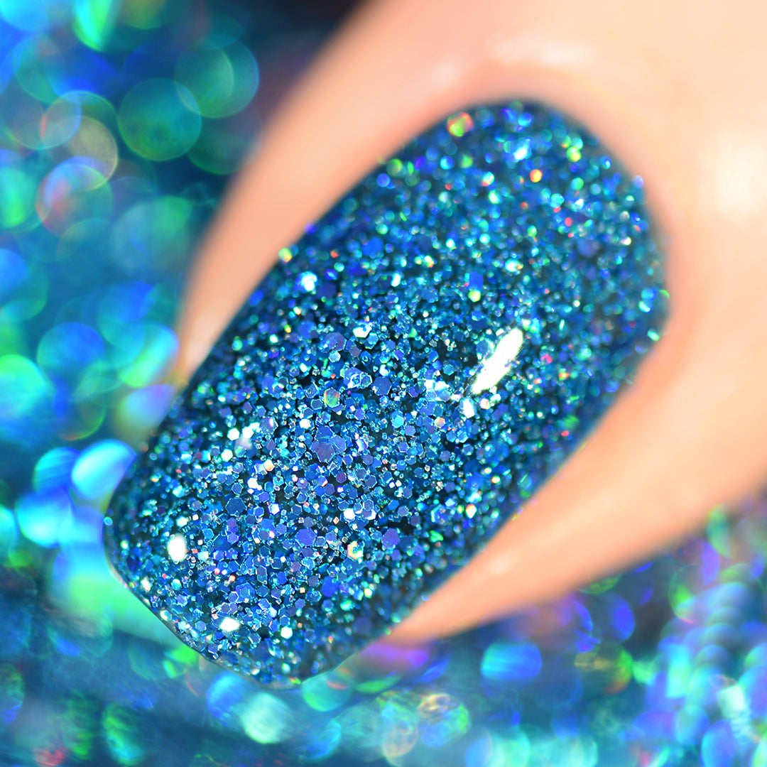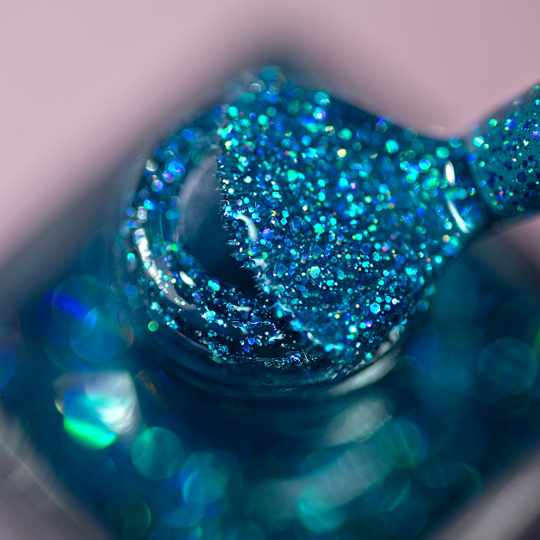 Turquoise-blue holographic glitter formula in a deep aqua jelly base