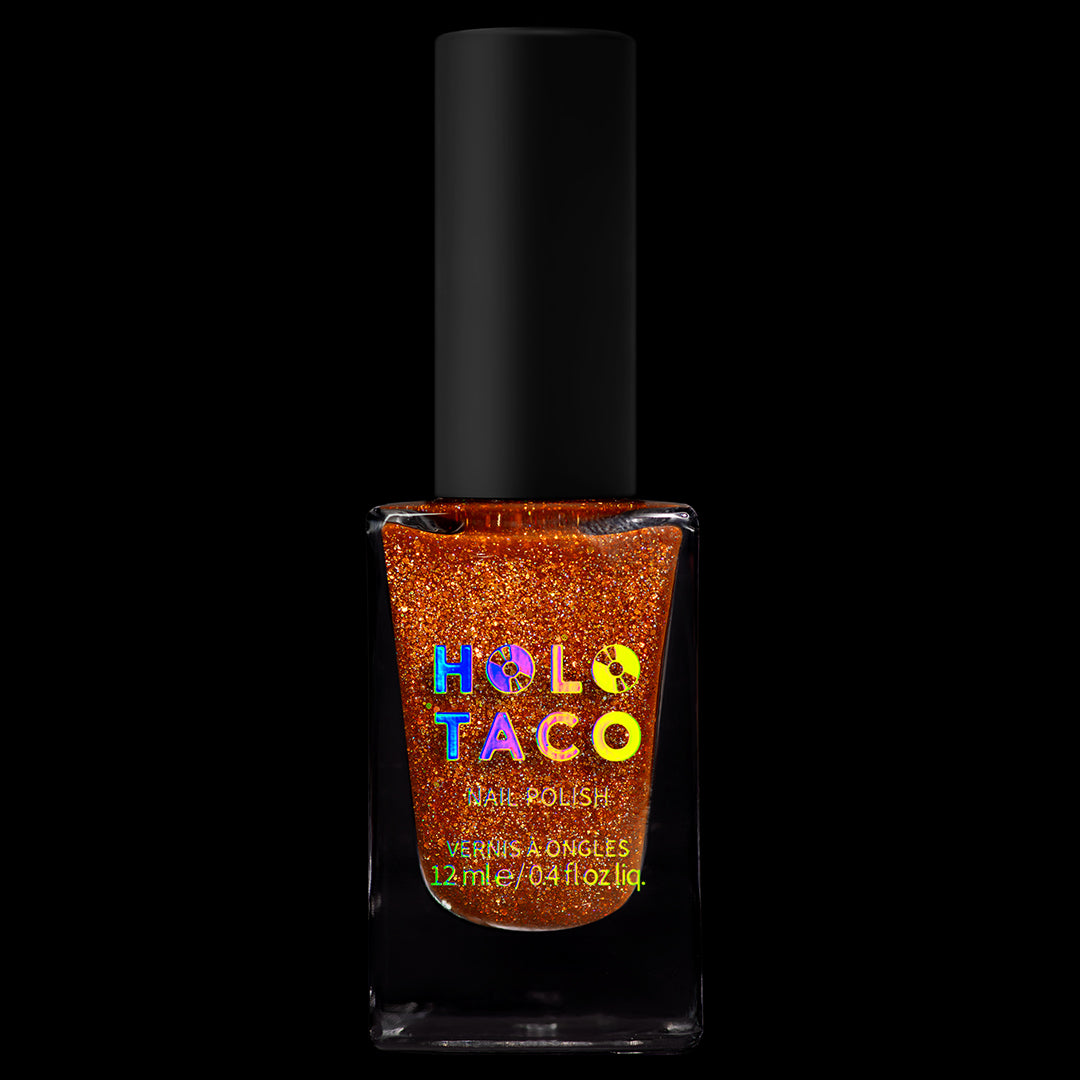 - Note: Holographic nail polish shows best under direct sunlight, halogen bulbs, or just your phone camera flash! Swatch photos as pictured have one coat of Glossy Taco or for optimal smoothness and shine.